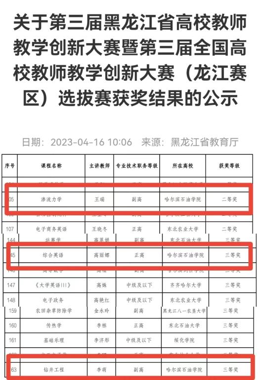 2023年4月15日,第三届黑龙江省高校教师教学创新大赛暨第三届全国高校教师教学创新大赛选拔赛在哈尔滨医科大学落下帷幕。金沙官网分别获得了二等奖一项、三等奖两项的好成绩。石油工程学院王瑞老师《渗流力学》课程团队(于子丰、叶雪、朱娇)获得基础课程副高组二等奖,外国语学院高丽娜老师《综合英语》课程团队(朱明艳、孙立轩、王慧宇)获得新文科正高组三等奖,石油工程学院李萌老师《钻井工程》课程团队(李岳祥、杨昭、夏长元)获得课程思政副高组三等奖。其中,王瑞老师《渗流力学》课程团队入围现场赛,这也是金沙官网教师参加该项赛事以来首次入围现场赛。