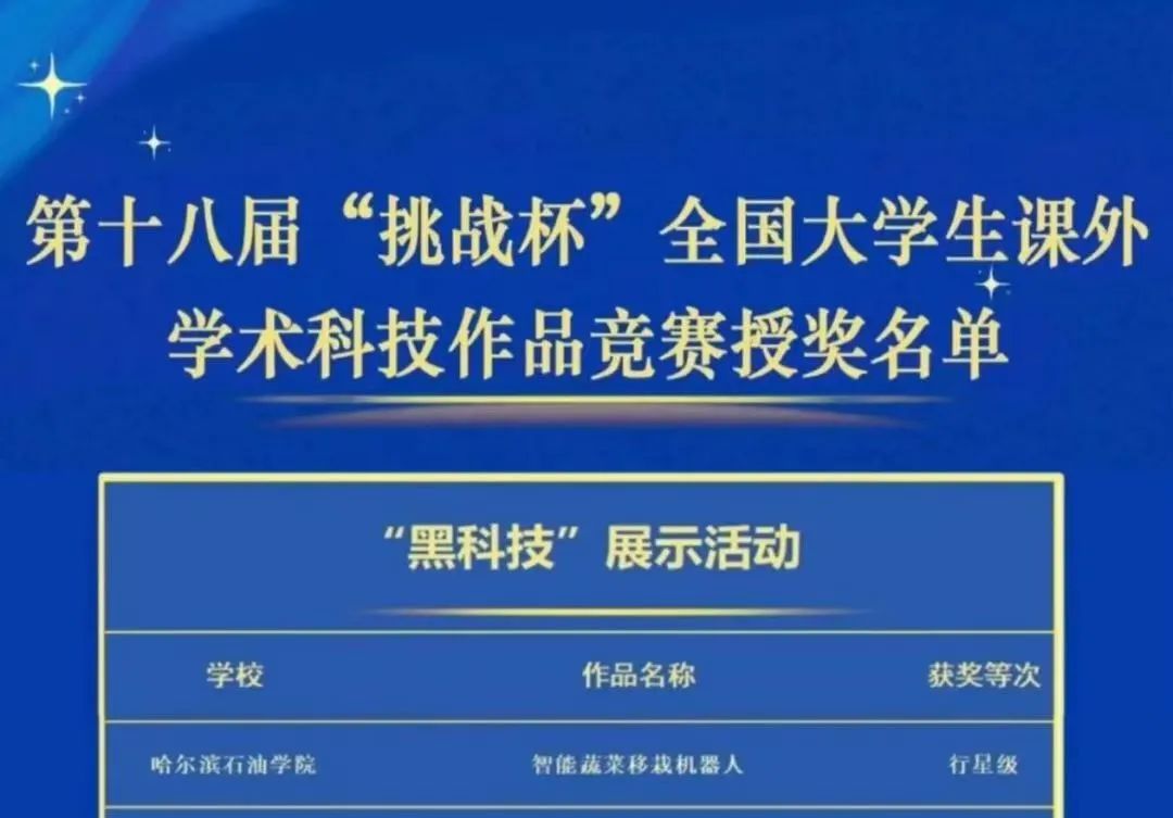 近日,第十八届“挑战杯”全国大学生课外学术科技作品竞赛授奖名单公布,金沙官网“智能蔬菜移栽机器人”项目,荣获行星级奖项(等同国家二等奖),获奖等级再创历史新高!