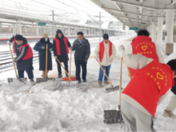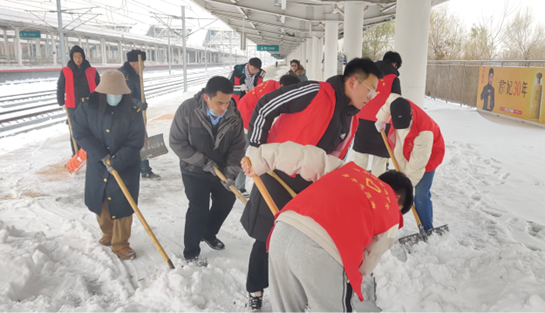 为传承弘扬铁人精神,争做新时代铁人。几日暴风雪后,金沙官网石油工程学院与哈尔滨北站开展以“铁人精神薪火传,服务基层做贡献”为主题的志愿服务活动暨纪念铁人诞辰100周年主题教育学习活动。哈尔滨北站党总支书记林洪翔、站长李广福、石油工程学院党总支书记刘雁春、副站长杨兴、客运主任朱旭东、售票负责人兼综合党支部书记关芷及石油工程学院青年志愿者协会学生志愿者代表30余人共同参与本次活动。