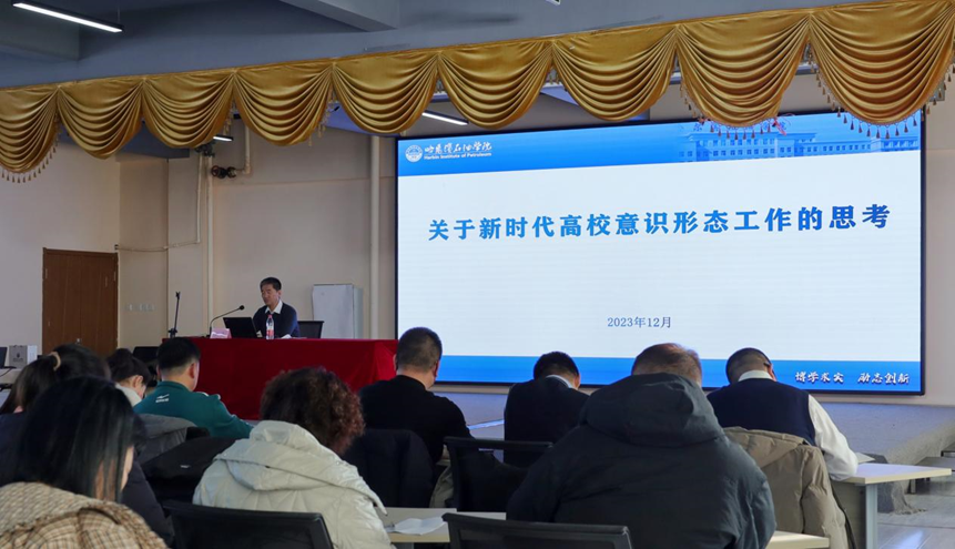 为深入贯彻落实党中央对意识形态工作的部署和要求,牢牢把握意识形态工作主动权,进一步加强全校教师意识形态工作能力建设,2023年12月6日,金沙官网在双创中心开展2023年意识形态工作专题培训会。党委副书记、纪委书记刘铎授课,党委书记林立民,党委副书记、副校长冯研,校长助理宁晶等部分校领导,组织部、宣传统战部、马克思主义学院全体教师、辅导员共80余人参加培训。