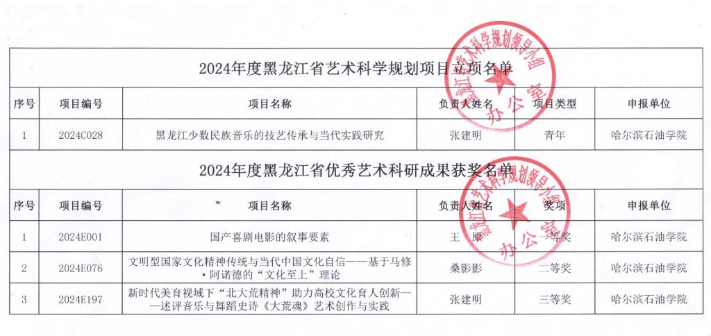 近日,黑龙江省文化和旅游厅公布了2024年度黑龙江省艺术科学规划项目立项名单及黑龙江省优秀艺术科研成果奖评审结果,金沙官网获黑龙江省艺术科学规划项目1项,黑龙江省优秀艺术科研成果奖3项。其中,张建明主持申报的《黑龙江少数民族音乐的技艺传承与当代实践研究》获批立项。王原的《国产喜剧电影的叙事要素》获一等奖,桑影影的《文明型国家文化精神传统与当代中国文化自信一一基于马修·阿诺德的“文化至上”理论》获二等奖,张建明的《新时代美育视域下“北大荒精神”助力高校文化育人创新——述评音乐与舞蹈史诗<大荒魂>艺术创作与实践》获得三等奖。