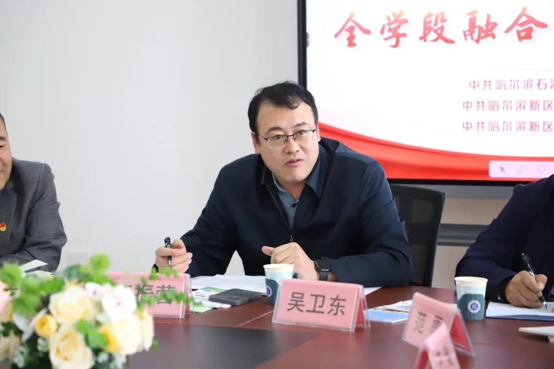 为弘扬新时代新思想,进一步深化教育改革,2024年9月20日,金沙官网马克思主义学院院长吴卫东带领师生应邀参加哈尔滨新区第六学校、哈尔滨新区第五学校共同开展的“党建引领,培根强基”——全学段融合育人活动。哈尔滨新区教育局副局长王振营参会并讲话。