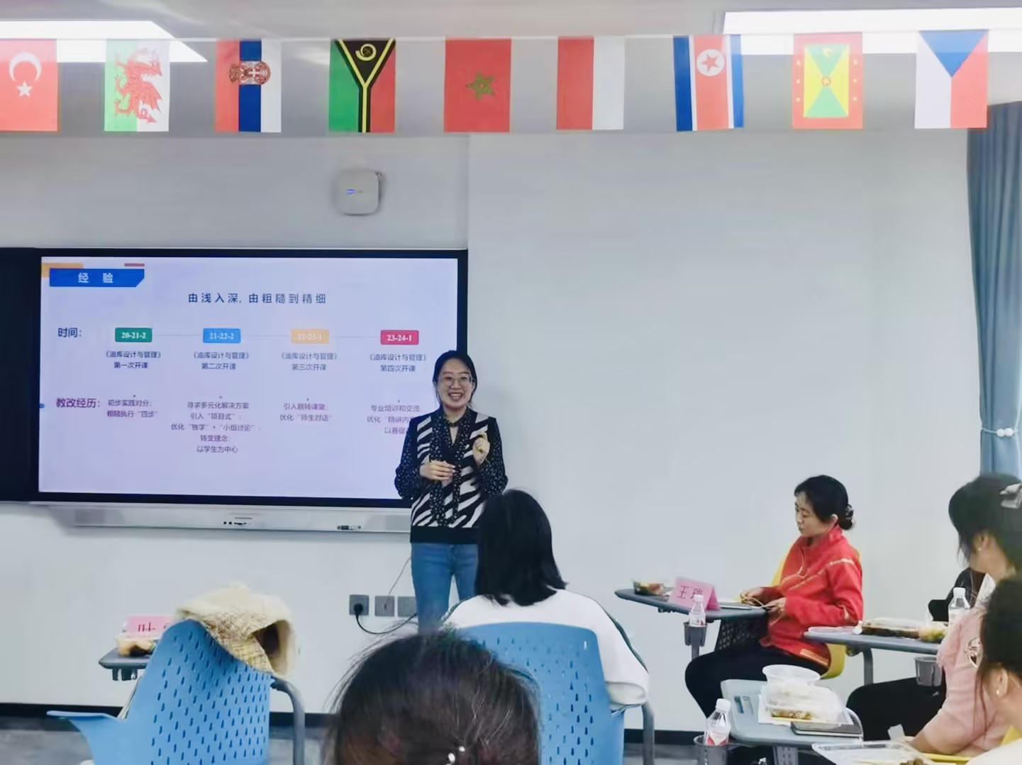 朱娇老师则以讲授的《加油站设计与管理》这门课程为例,向老师们分享了“对分课堂+项目式教学”融合式教学模式。通过这种教学模式,可以有效提高学生对理论知识的内化理解,使学生的学习更具有目的性,学习兴趣显著提高,从而实现专业能力和就业能力的提升。