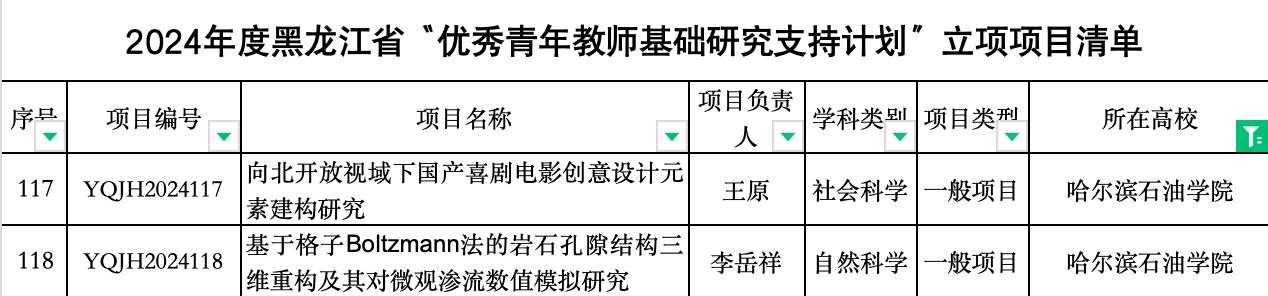 其中,艺术与教育学院王原副教授的“向北开放视域下国产喜剧电影创意设计元素建构研究”获批优青社会科学一般项目;石油工程学院李岳祥副教授的“基于格子Boltzmann法的岩石孔隙结构三维重构及其对微观渗流数值模拟研究”获批优青自然科学一般项目。
