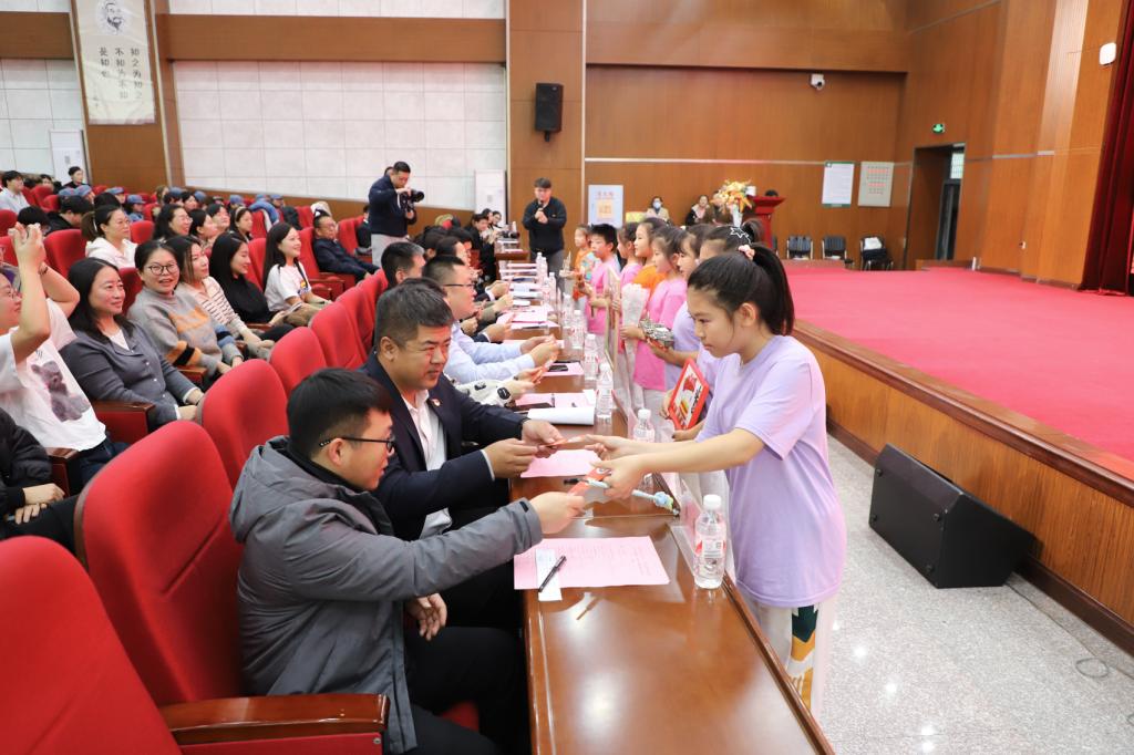 (小学生代表为学校领导赠送庆祝建国75周年两校共同设计的书签)