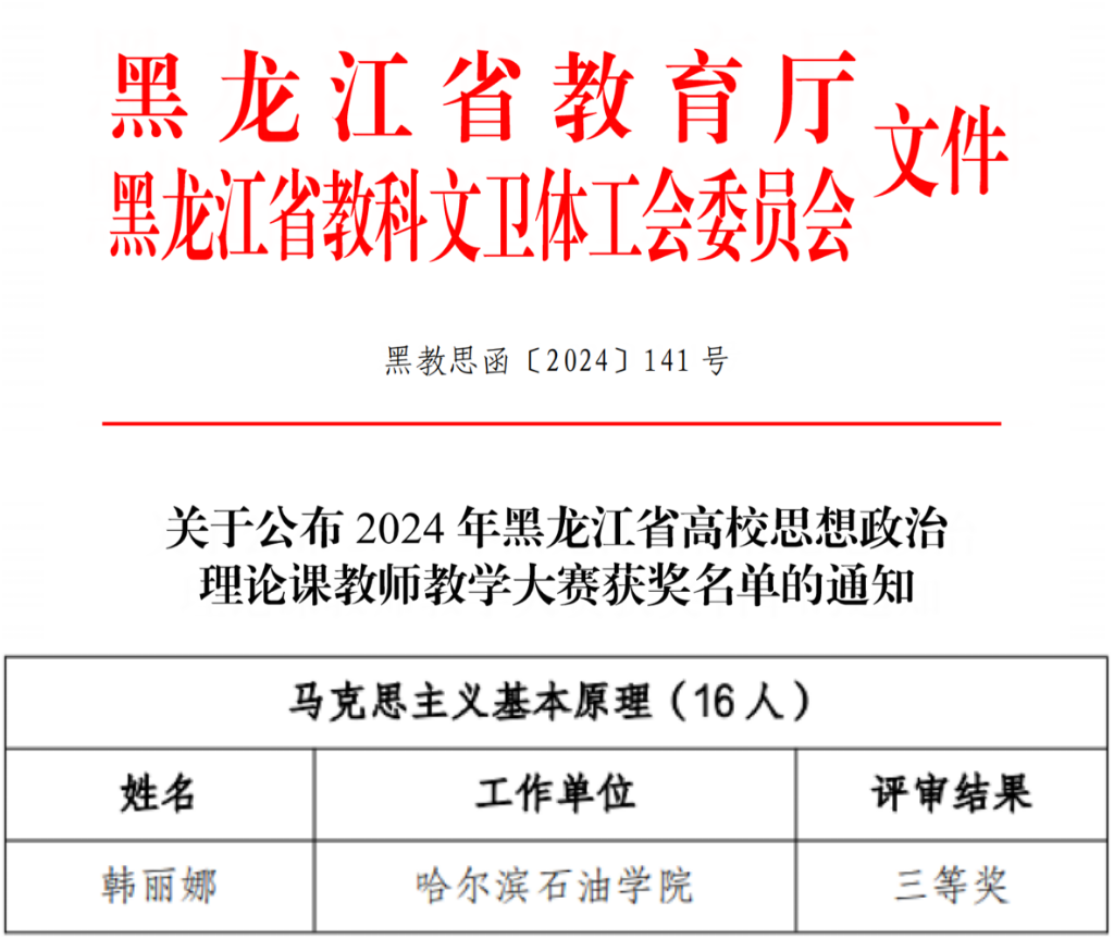 近日,黑龙江省教育厅、黑龙江省教科文卫体工作委员会公布了《2024年黑龙江省高校思想政治理论课教师教学大赛获奖名单》,金沙官网马克思主义学院青年教师韩丽娜获得本科组《马克思主义基本原理》课三等奖。