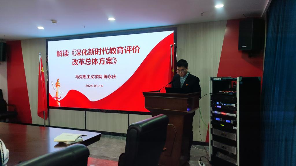 马克思主义学院教师陈永庆从深化新时代教育评价改革的行动纲领、关键点等方面对《深化新时代教育评价改革总体方案》进行了深入的解读。