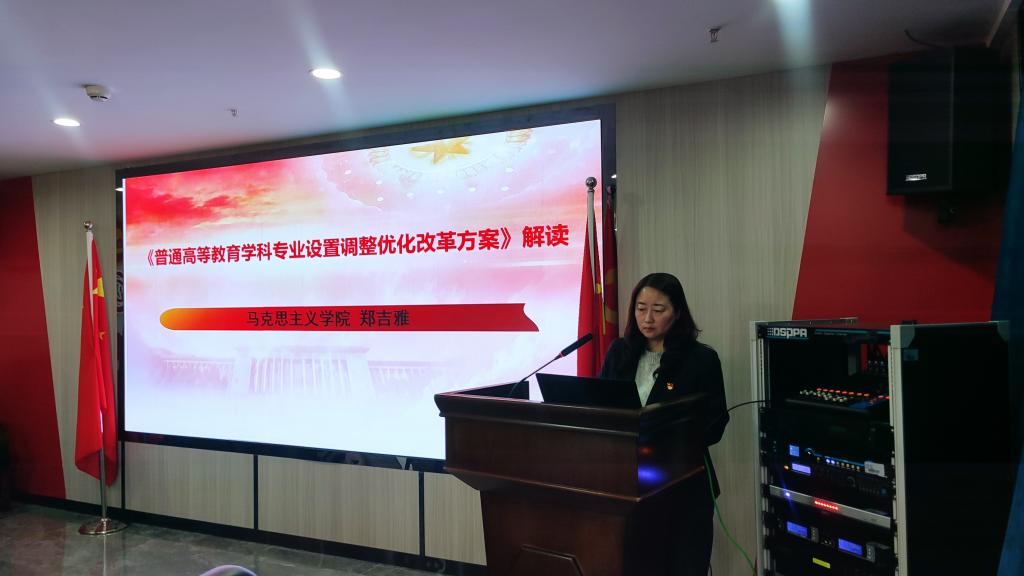 马克思主义学院教师郑吉雅结合自身工作实际,从文件出台的背景、主要内容措施和重要意义三个方面对《普通高等教育学科专业设置调整优化改革方案》进行了解读。