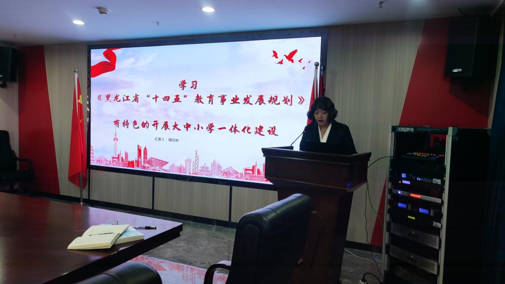 马克思主义学院教师周红叶从主要内容、重大意义,并结合“有特色的开展大中小一体化建设”对《黑龙江省“⼗四五”教育事业发展规划》进行了全面而深入的解读。