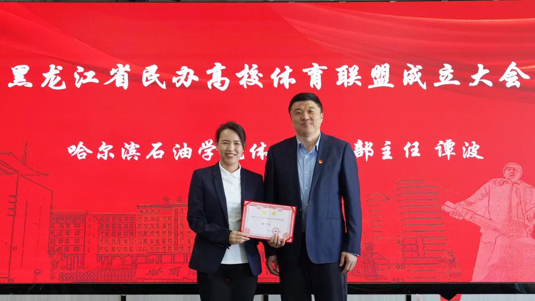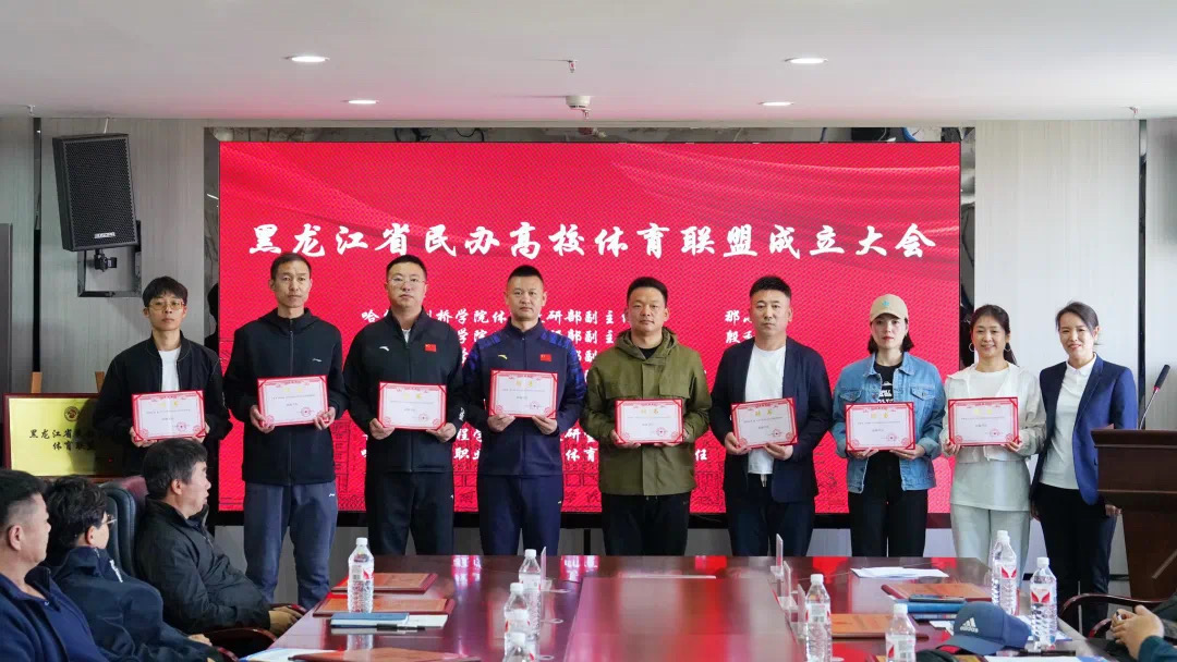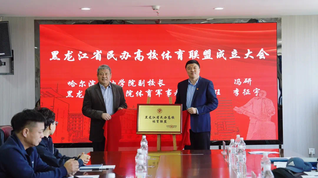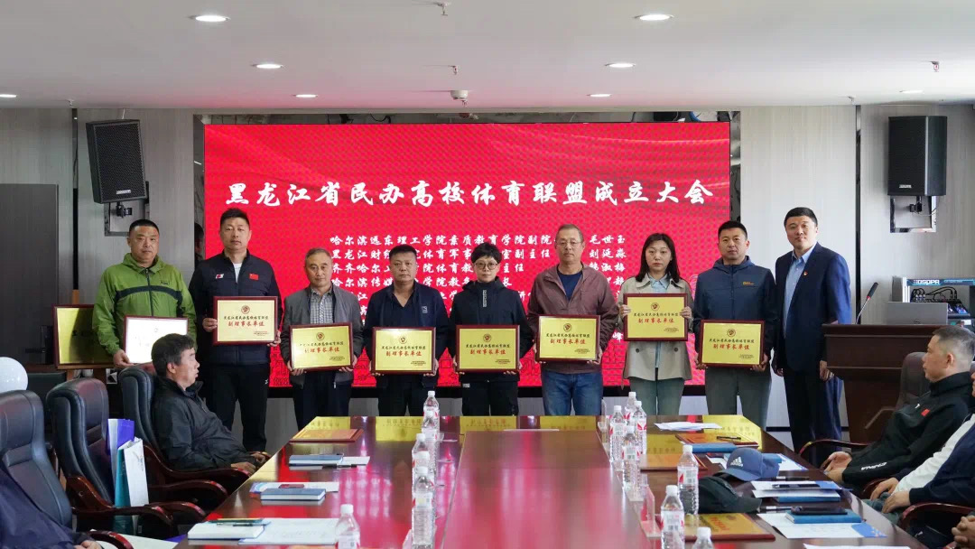 黑龙江省上点舒华体育用品有限公司总经理沈有启、黑龙江工程学院昆仑旅游学院军体部主任关吉臣、哈尔滨传媒职业学院教务处处长马智超代表企业、本科高校、专科高校,共同见证联盟成立。