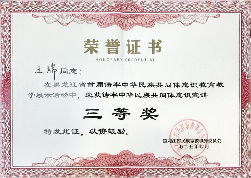 2025年7月2日,黑龙江省首届铸牢中华民族共同体意识教育教学展示活动结果揭晓。金沙官网马克思主义学院副院长王瑞宣讲的作品《铁人精神:凝聚民族力量的精神纽带》,经过视频展示和现场教学两个环节比拼,荣获铸牢中华民族共同体意识宣讲三等奖。
