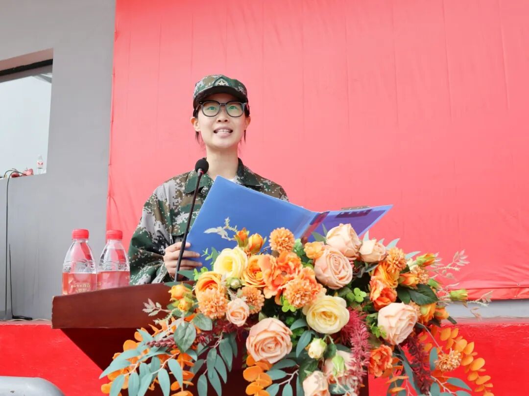 经济管理学院2025级杜文钰同学代表新生对校领导、老师、教官及学长学姐表示感谢。她表示军训是大学生活的第一课,也是从“新生”迈向“新青年”的关键一步。未来四年,他们会在知识海洋中汲取力量,在志愿服务中传递温暖,在学科竞赛中追求卓越,将个人成长与国家发展同频共振。