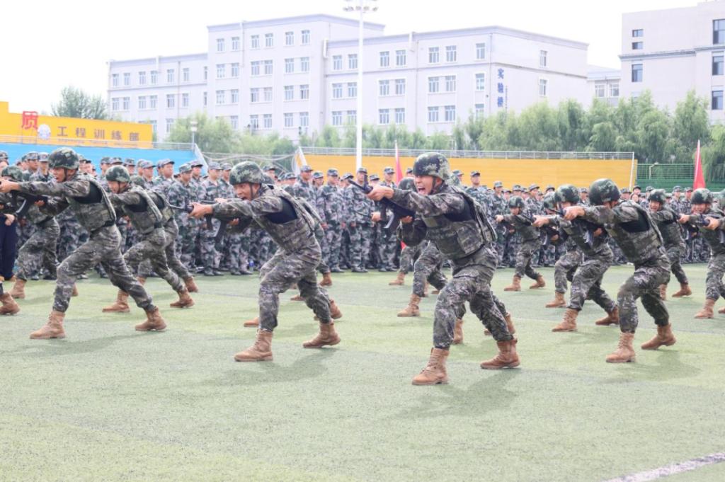 军训团教官身着迷彩服,迈着整齐雷厉的步伐入场。他们身姿挺拔、目光坚定,动作利落连贯,场面恢宏震撼,既显军人飒爽英姿与严谨作风,也展现哈油人坚毅果敢、自信坚定的风貌,获现场师生阵阵掌声。