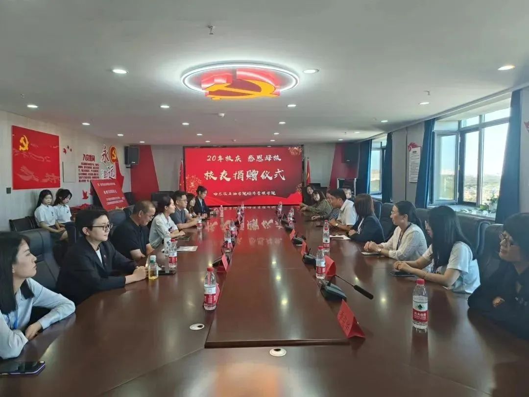 仪式在院长助理宋蕾的主持下拉开帷幕。校领导和院领导首先对三位优秀校友返回母校表示热烈欢迎,对向母校慷慨捐赠表达了衷心感谢。随后,我院优秀校友代表在发言中分享了自己在母校的求学经历,衷心的感激母校的辛勤培育,表示看到母校发展日新月异,社会认可度不断提高,身为一名经管学子,倍感荣幸和自豪,今后会一如既往的关心和支持母校,为母校高质量发展贡献一己之力!任院长在会议最后表示,此次捐赠生动诠释了校友心系母校、感恩母校的深厚情怀和关心教育、回报社会的责任担当,必将激励在校学子勤奋进取、励志成才。