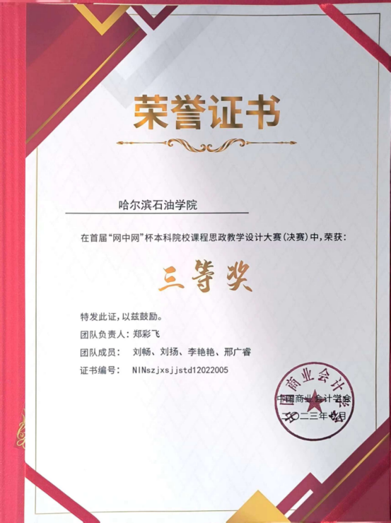 7月1日,由中国商业会计学会举办的首届“网中网”杯本科院校课程思政教学设计大赛决赛在大连财经学院举行。我院财务管理专业郑彩飞教学团队通过赛前的认真准备、反复演练,在激烈的角逐中荣获全国决赛三等奖。
