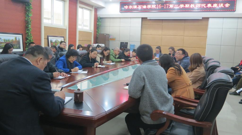 2017年4月26日上午9点,学校在主教学楼320会议室召开2016-2017学年第二学期教师代表座谈会。校长谢永利、副校长徐克非、副书记栾敏、校长助理冯研出席了会议,校办、人事处、学工处、后勤部门负责人到场参会,来自各教学单位的40名教师代表参加了会议,会议由教务处处长王永辉主持。