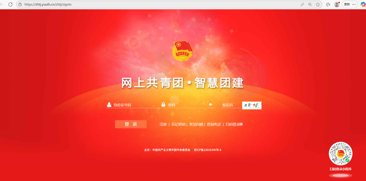 【注】:若显示身份证或密码错误,请联系毕业院校确认本人是否已被录入“智慧团建”系统。若确认在系统内,可联系团支部管理员获取密码重置码,拿到密码重置码后打开系统首页选择“忘记密码”,按照页面提示操作即可。若未录入则需点击注册进行注册。成功更改密码后请牢记密码避免日后找回的麻烦。※ 只能在电脑PC端登录