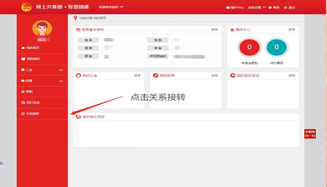 1.团员个人发起:团员登录系统进入个人中心,点击左侧“关系转接”菜单。