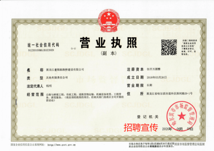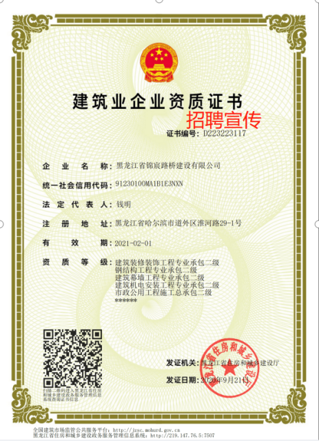 黑龙江省锦宸路桥建设有限公司拥有市政公用工程施工总承包二级资质、建筑装修装饰工程专业承包等5类二级资质,公司经营范围涉及公路与桥梁工程,市政工程等。