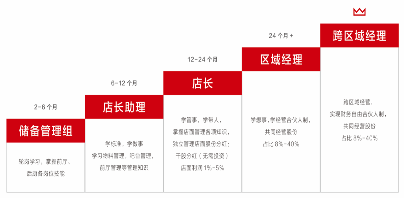 •储备干部一经录用即进入储备期,开启合伙人的培养阶段。企业提出“发展无天花板”人才晋升口号,对人才发展不设最低培养期,只要有能力者即可进入“发展快通道”,经过“PK赛道”竞技,通过各阶段考核,即可实现快速成长。