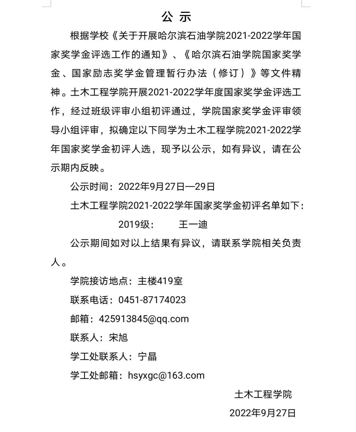 【土木快讯】土木工程学院2021-2022学年度国家奖学金公示