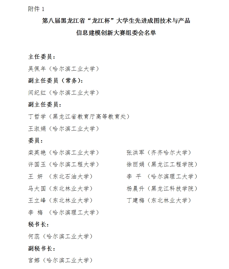 附件1:第八届黑龙江省“龙江杯”大学生先进成图技术与产品信息建模创新大赛组委会名单