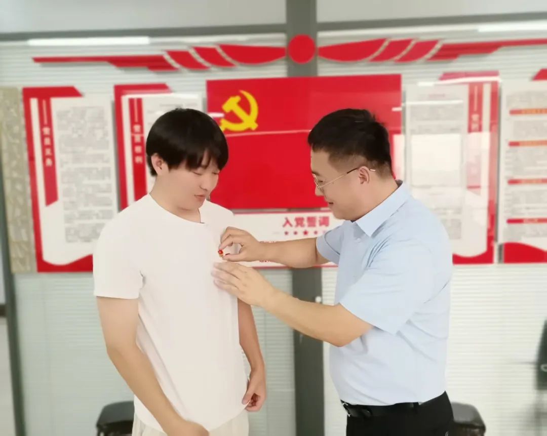 活动伊始,党总支书记刘强亲手为新接收预备党员佩戴党徽。闪耀的党徽别在胸前,不仅是身份的象征,更承载着沉甸甸的责任与使命。刘书记对新党员提出殷切期望,希望他时刻牢记党员身份,将个人理想融入党和国家事业,在教育教学岗位上勇挑重担,用实际行动践行对党的忠诚,为党组织注入新鲜活力。