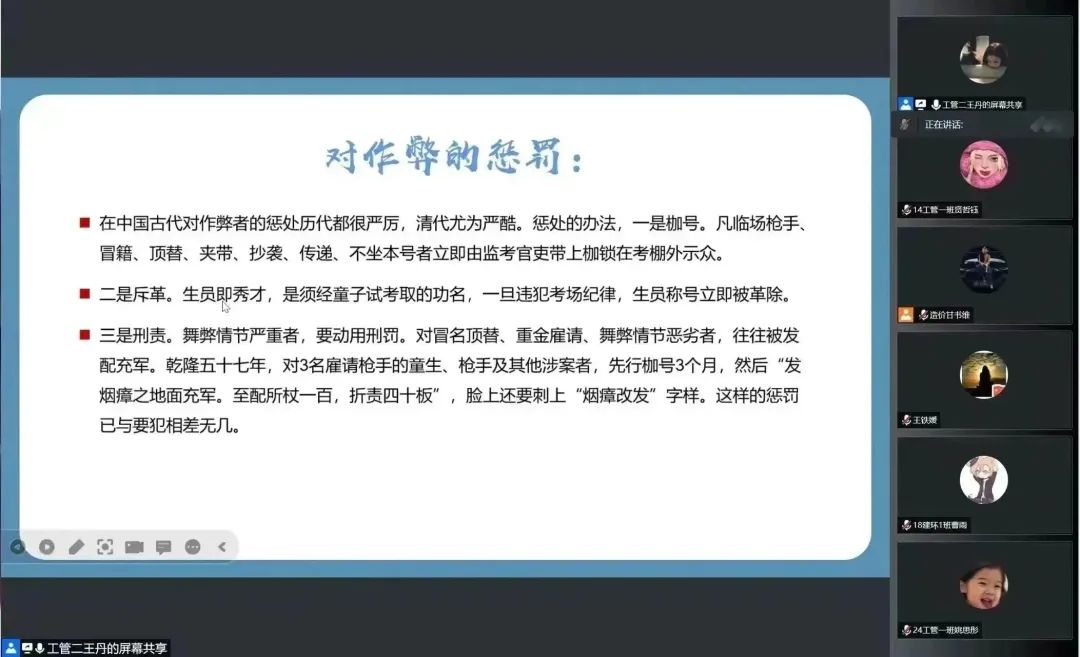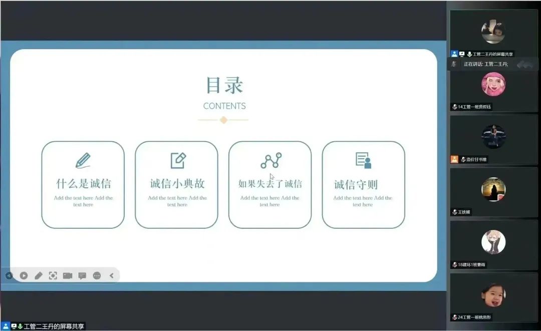 为践行社会主义核心价值观,引导同学们共同倡导诚信风气。土木工程学院于2022年12月3日召开了以诚信教育为主题的班会。本次班会在线上进行,由2022级辅导员王铁媛主讲,2022级全体同学参加。