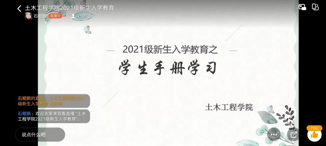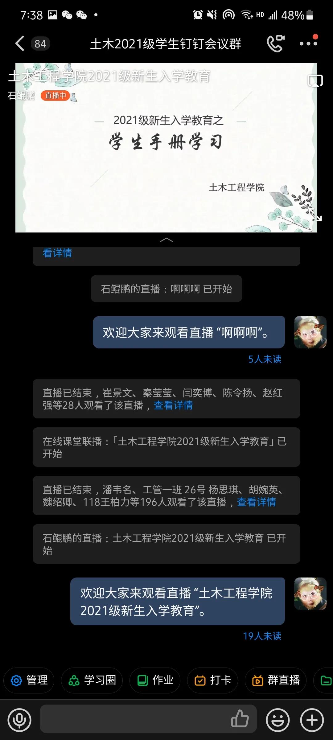 无规矩不成方圆《学生手册》是一盏指引学生在大学前行的明灯更是学生日后在校园学习、工作和生活所要严格遵守的基本准则。为了让2021级新生系统地了解金沙官网学生教育与管理等相关规定。10月2日晚6点,土木工程学院2021级全体新生在辅导员赵宇老师的带领下通过钉钉平台的方式共同学习了《金沙检测线路js69学生手册》。