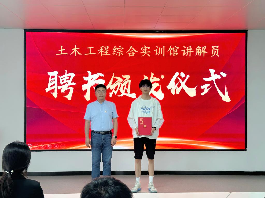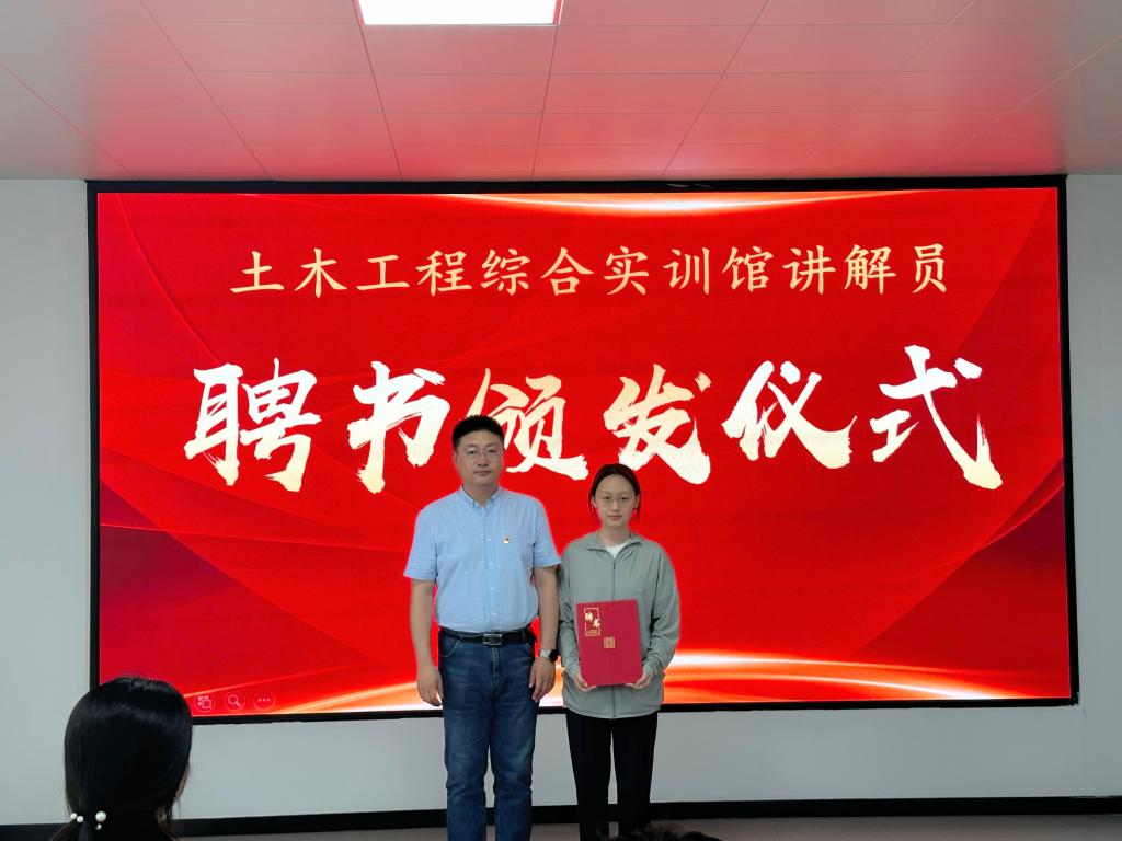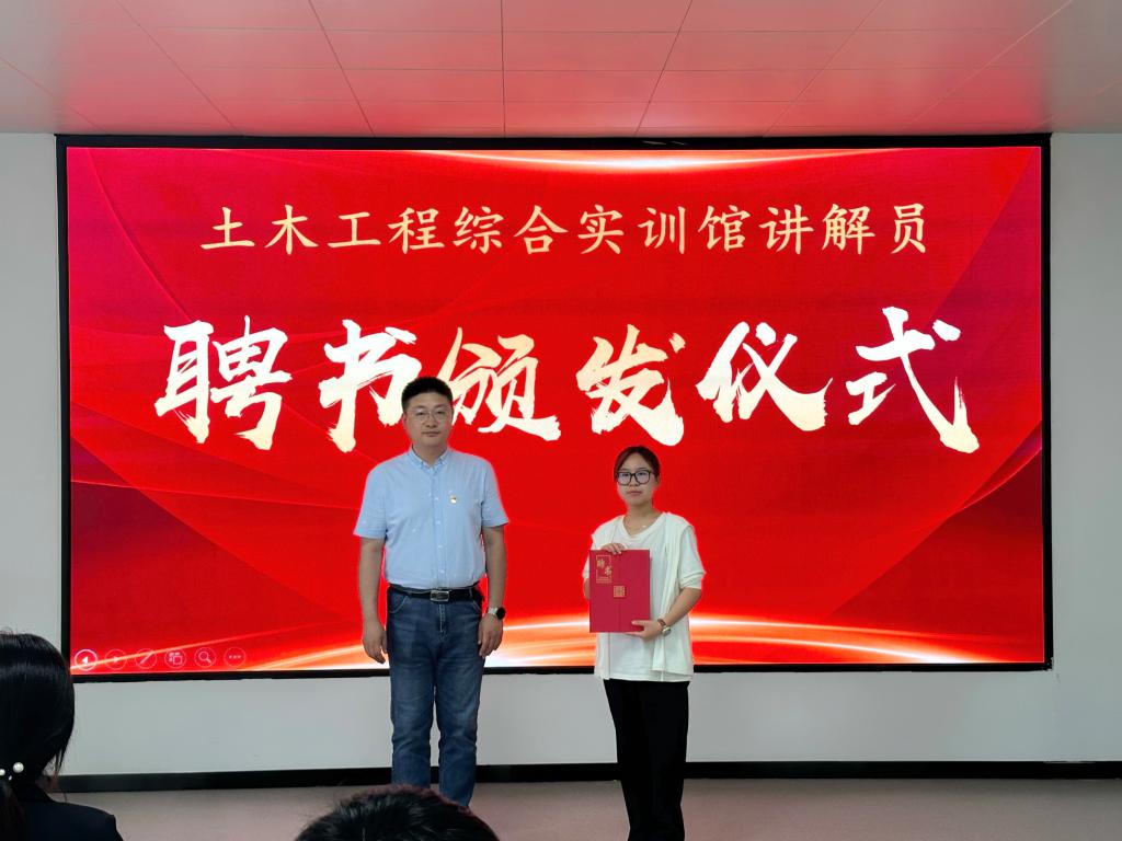 为提升学院土木工程综合实训馆学生讲解员队伍的工作热情和业务能力,同时鼓励和肯定同学们工作的热情与努力付出,2024年6月14日中午,土木工程学院在实训馆多功能教室开展了土木工程综合实训馆学生讲解员聘书颁发仪式。学院党总支书记宋旭、指导教师管艺濛出席此次活动。