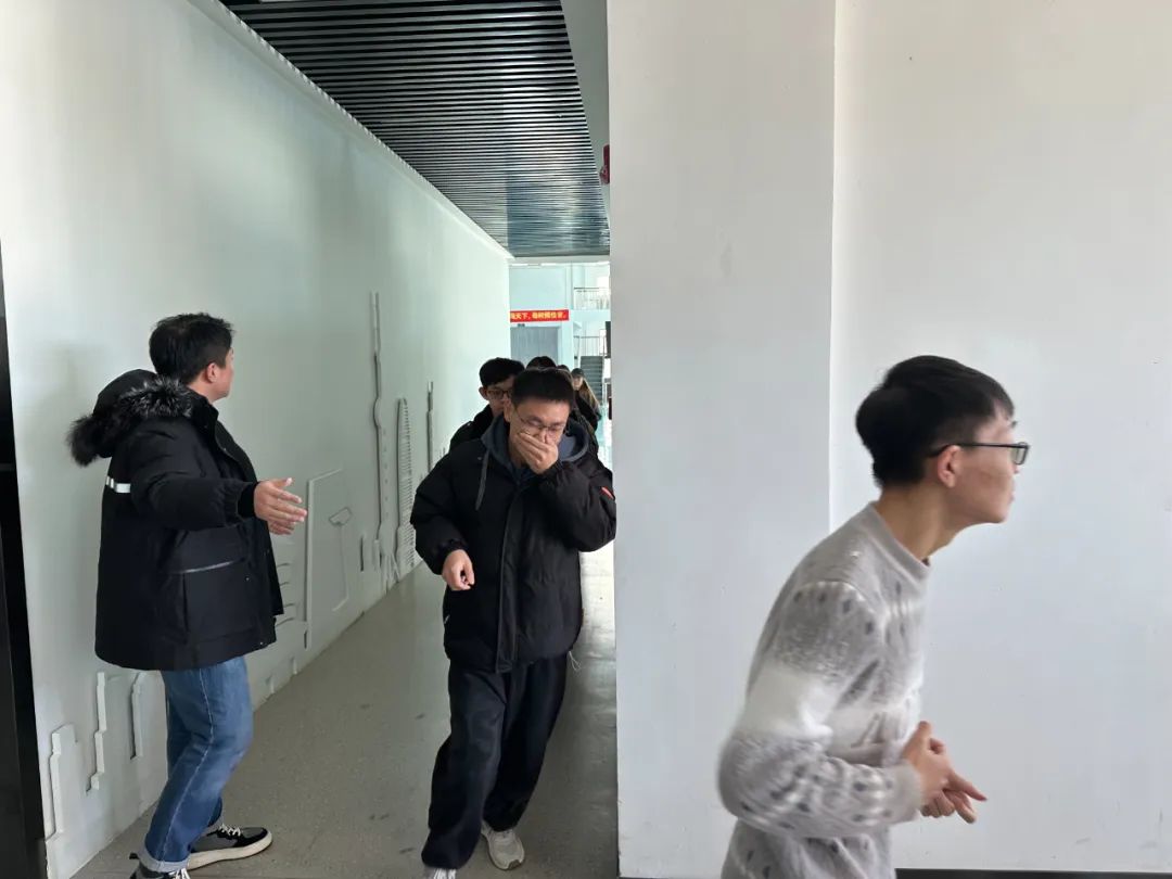 随后消防疏散演练展开,警报拉响后,实验室负责人迅速组织师生按预定路线疏散,大家冷静有序,低姿前行,快速到达安全区域并完成人数清点汇报,展现出良好的应急素养与团队协作。