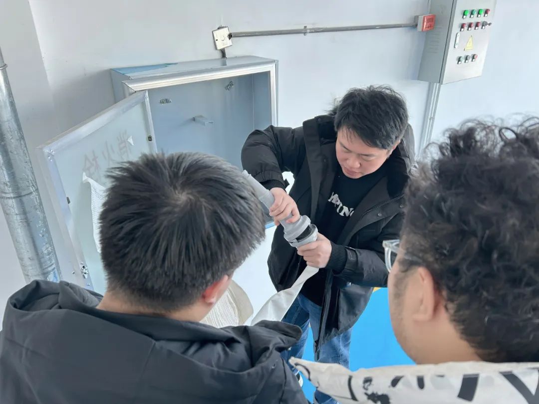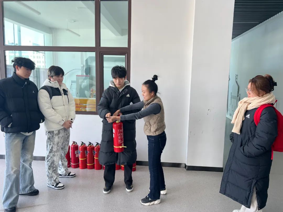 最后进行安全设备使用演示,老师对医药箱、消防栓、防火沙和灭火器等设备的使用方法逐一讲解并实操展示,包括医药箱急救处理、消防栓连接使用、防火沙灭火操作、灭火器 “提、拔、握、压” 步骤等,部分师生还亲身体验,有效提升了大家对安全设备的操作技能。