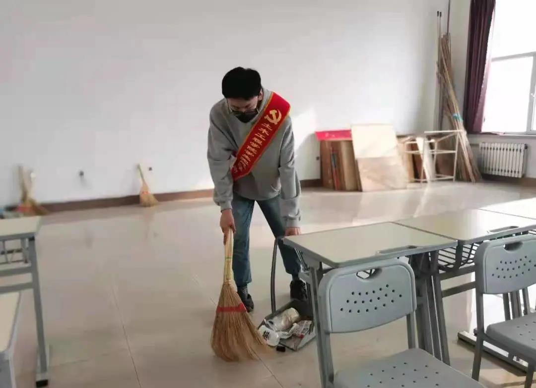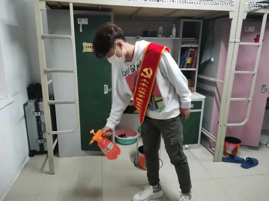 由几位学生党员牵头,佩戴红色绶带,首先进入学生公寓利用喷壶对每个寝室的地面角落等进行喷洒消毒,防止病菌滋生。紧接着,学生党员们到达教学楼,对教室地面进行清扫、杀菌,向同学们展示了在疫情期间如何正确有效的实现对自身的防护以及保持干净的环境。学生党员带头行动,希望同学们可以自觉遵守学校有关疫情防控工作的规定,树立正确的防疫观念,积极配合学校工作。