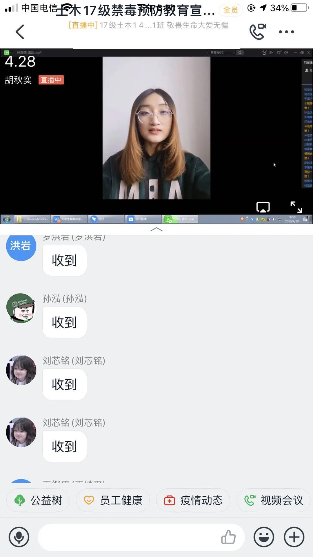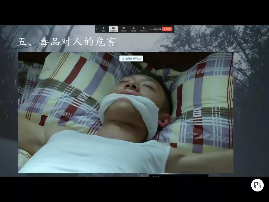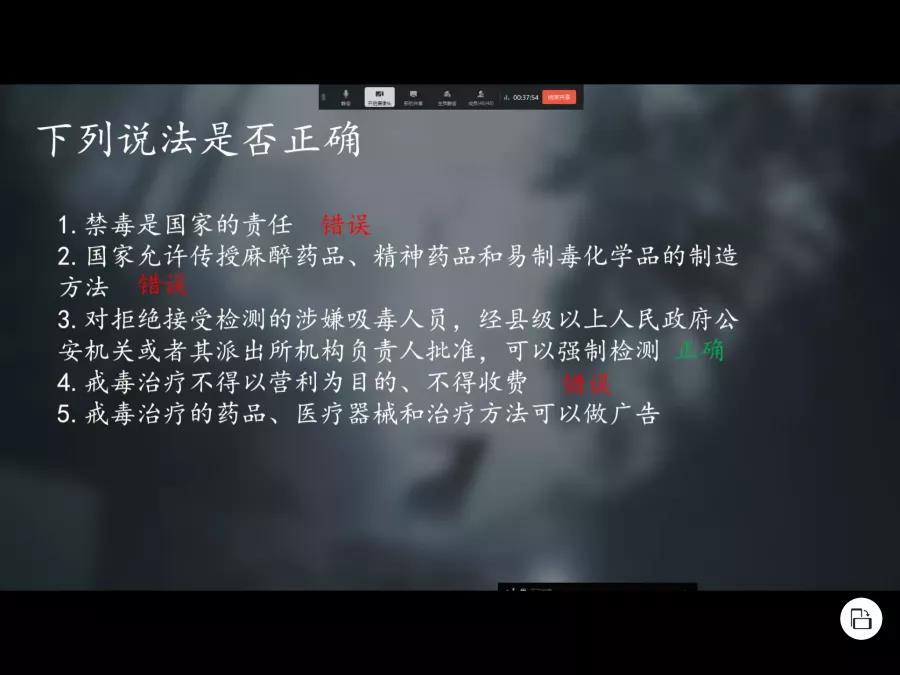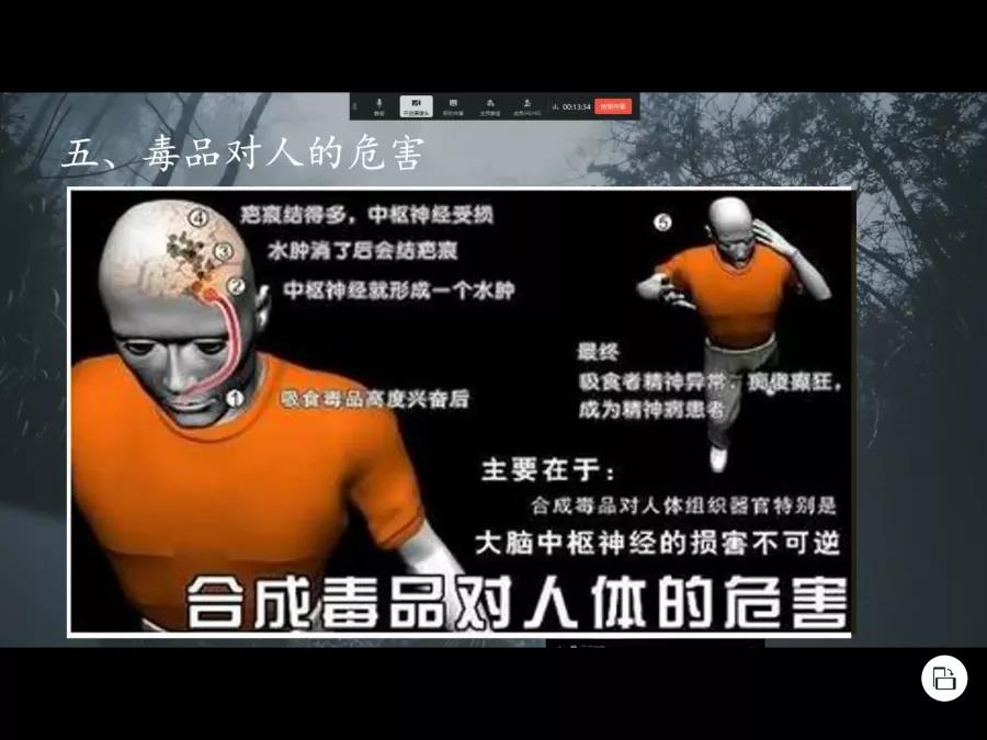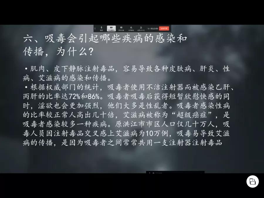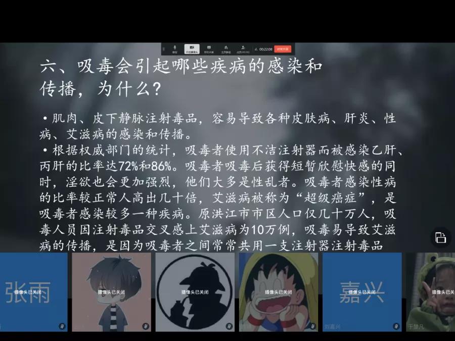各班级通过腾讯会议和钉钉视频进行线上班会。同学们纷纷在弹幕里和钉钉群里进行互动发表感言。班会主要通过以下几部分的内容向同学们宣传禁毒教育:一、毒品的定义和种类。二、毒品的基本特性。三、毒品的传播途径;四、毒品会引起哪些疾病感染和传播。五、禁毒宣传视频。六、毒品和禁毒教育相关知识竞答。七、同学代表发言进行禁毒倡议。