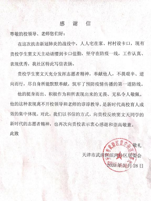 在这个信息化时代的社会,每个人都用着微信、QQ联系着彼此。但是今天土木工程学院2017级辅导员老师却收到了一封特殊的信件,这是一封来自天津市武清区滨河社区居委会的感谢信。