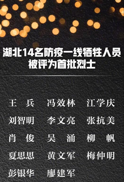 清明节前,七七之后。李文亮等14名一线勇士被评为首批烈士。 他们分别是:王兵、冯效林、江学庆、刘智明、李文亮、张抗美、肖俊、吴涌、柳帆、夏思思、黄文军、梅仲明、彭银华、廖建军。他们都是逆行的英雄,血肉筑起了新的长城。