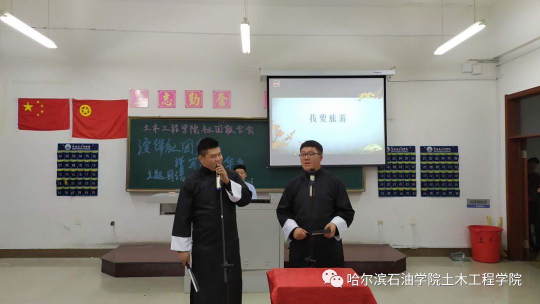 首先由肖鹏和刘家鸣两位同学带来的相声《我要旅游》,以传统的民间说唱艺术,仅凭最通俗的方式,就十分成功的调动起了观众们的兴趣。