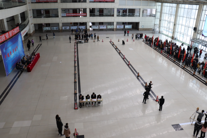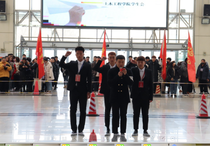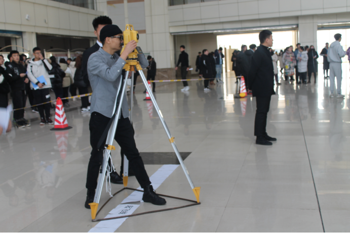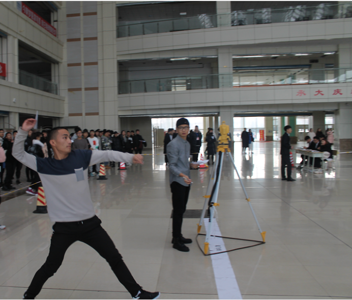 第二环节为竞技比赛,竞技比赛分为直线距离赛和滞空时间赛,每个学院分为派两名选手进行比赛,此次比赛我们采用标准软尺和全站仪的方式测量。测量距离为投射线到纸飞机第一个触碰地面或任何物品之间的长度,结果精确到毫米,为保证大赛的公平公正,在竞技比赛开始之前,由裁判长带领裁判员进行了宣誓。
