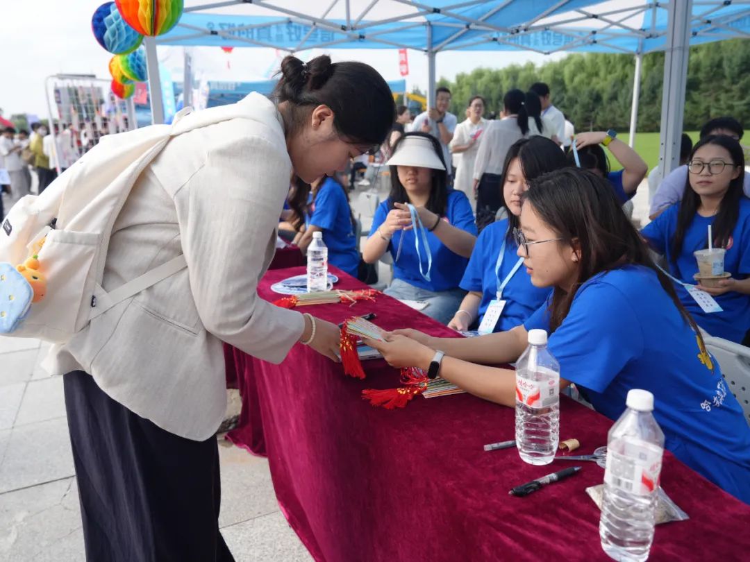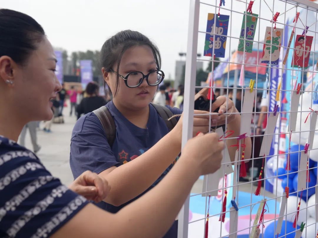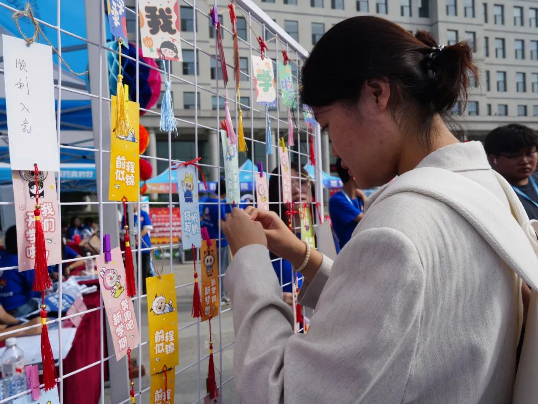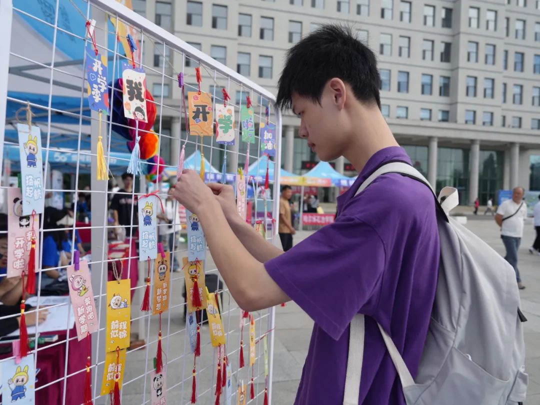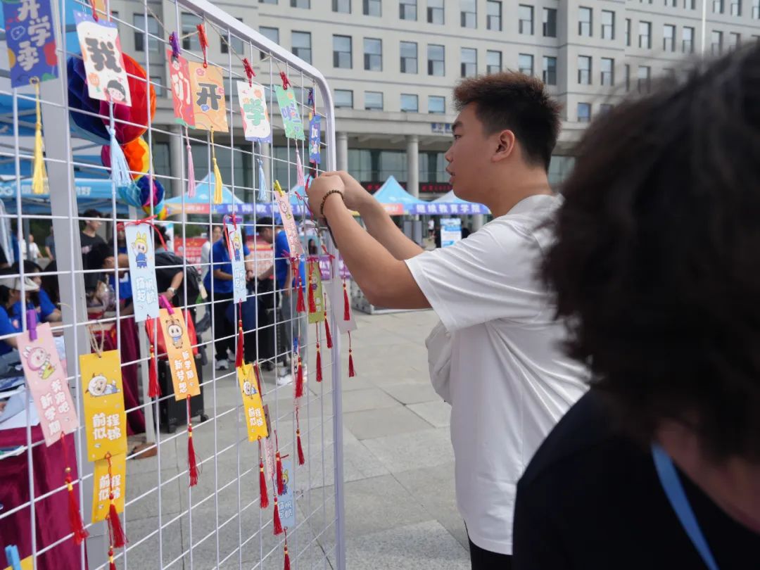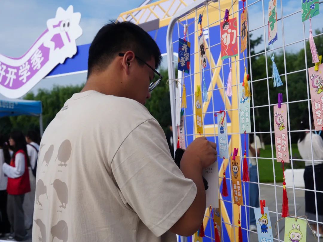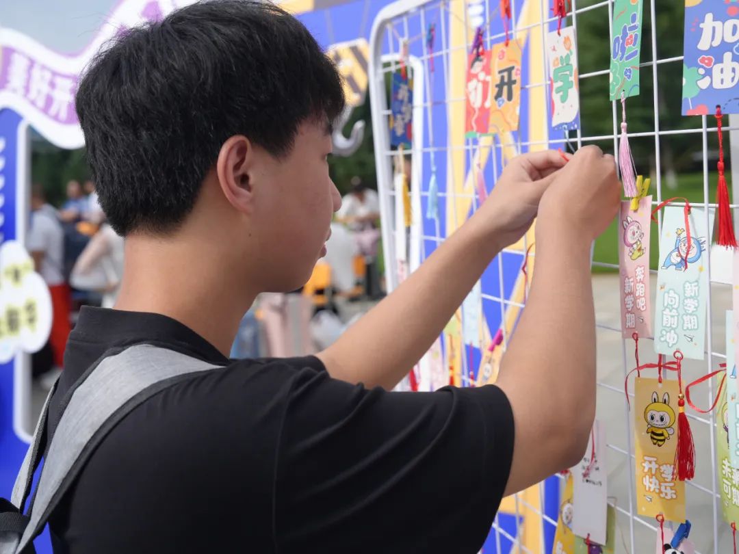 在新生报到处旁,活动专区格外醒目。一张张印有“新学期奔跑吧”“未来可期”“扬帆起航”等字样的心愿卡摆放在展架上,等待着承载新生们的期许。刚办完入学手续的新生们,或在父母的陪伴下,或与新结识的同学并肩,拿起笔认真书写着他们对大学的美好愿景。