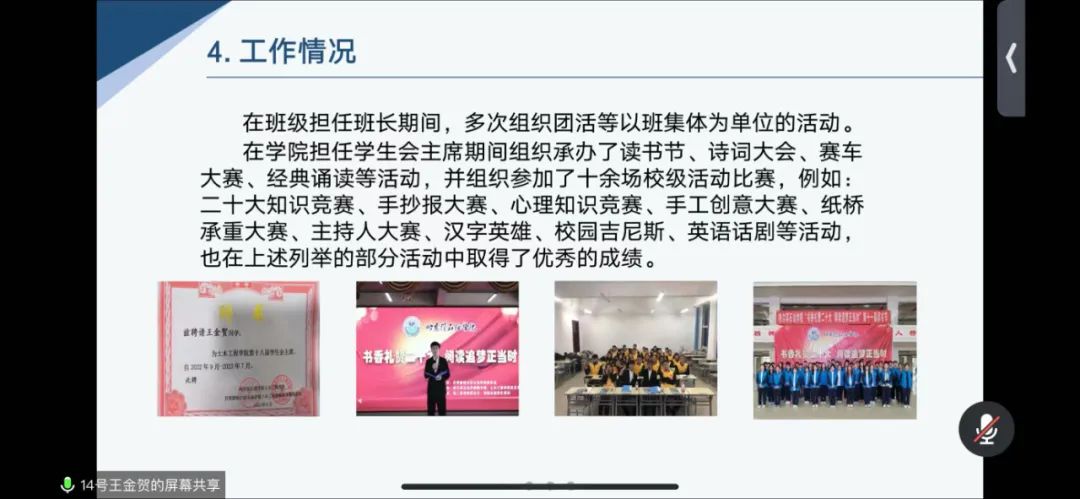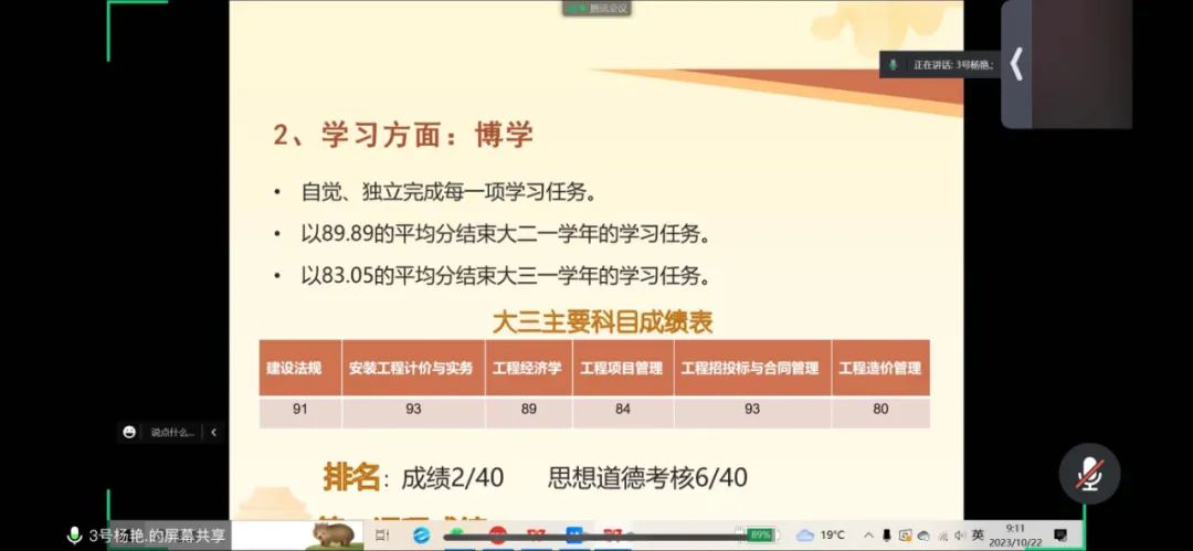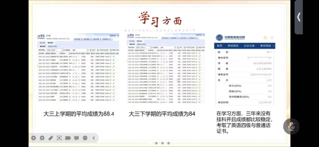 参加答辩的48名候选人依次从思想政治表现、学习成绩、社会实践、志愿服务和竞赛获奖等五个方面结合PPT对自己进行全方面的展示,充分展现了土木学子优良的综合素养和专注的学习能力。个人答辩后评委老师对同学们的展示针对性地提出了问题,在肯定学生取得成绩和进步的同时也指出了可以做得更好的地方,并给出了中肯的建议。学生整体答辩会结束后,结合学生答辩及得分情况,我院评审工作小组本着公平、公开、公正,择优推荐的原则,现场公布了学院国家励志奖学金推荐者的名单。评委们对于答辩的同学的表现以及成绩给予充分肯定,希望同学们明确学习目标,做好职业规划,努力为广大同学树立良好榜样,同时也希望同学们心怀感恩,成为品学兼优、全面发展的有为青年。