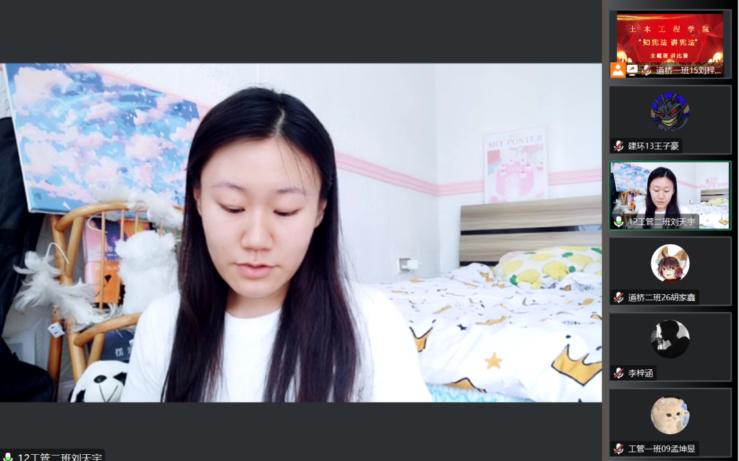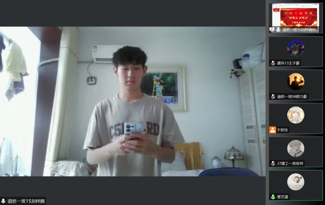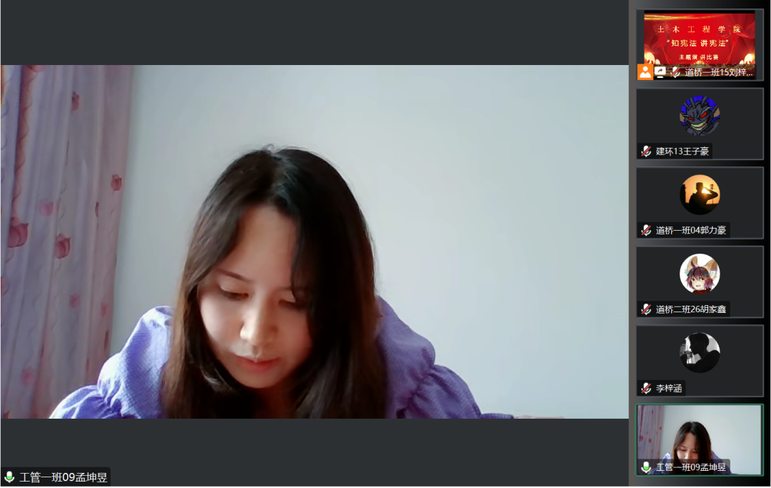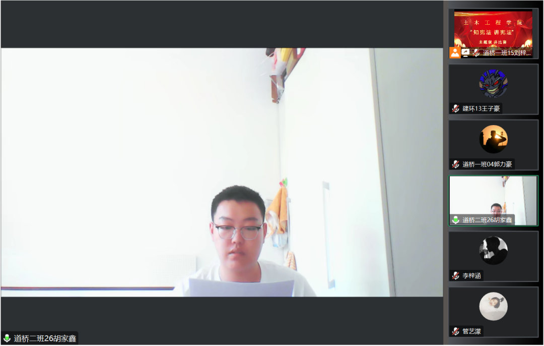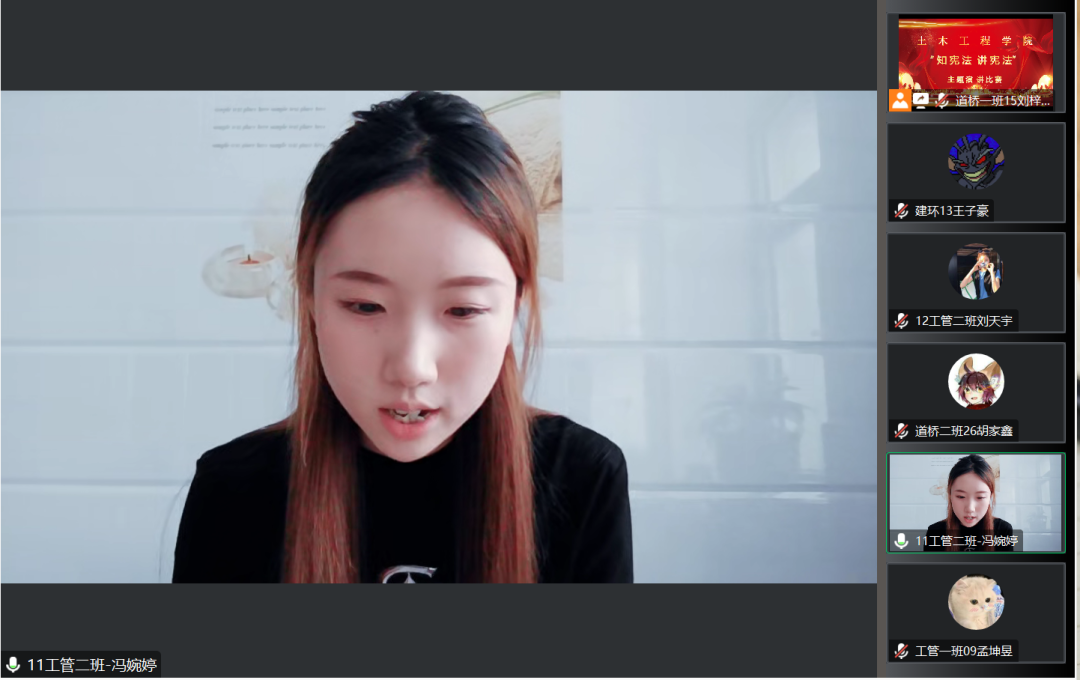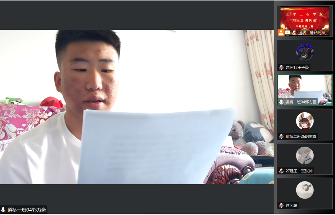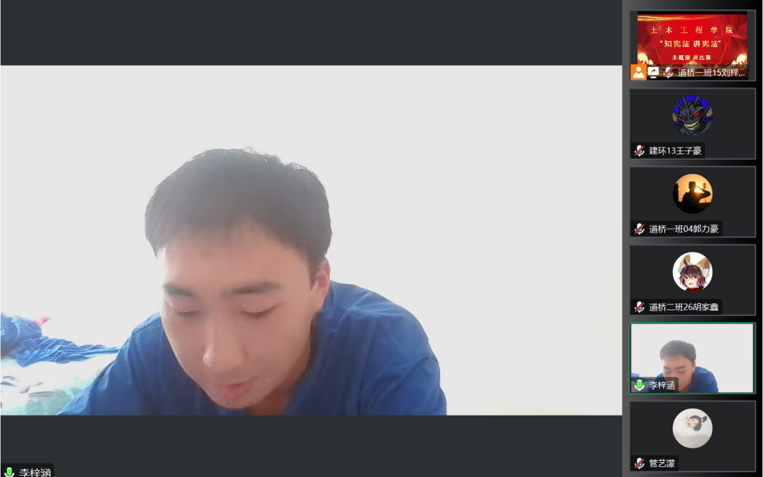 为深入学习贯彻习近平法治思想,进一步落实习近平总书记关于加强宪法法治宣传教育的重要指示精神,引导学生坚定社会主义核心价值观,增强学生的法律意识和法律素养,2023年7月11日下午,土木工程学院举办以“知宪法,讲宪法”为主题的演讲比赛,此次活动通过线上进行,由各年级学生代表参加。