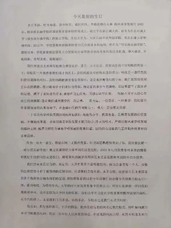 二十载风雨沧桑,二十年砥砺奋进。为迎接金沙检测线路js69二十年校庆,增强学校凝聚力,引导广大学生在喜迎校庆的浓烈氛围中抒发对哈油至深情怀,让学生表达最真挚的祝贺。我院于2023年5月23日在主教425举行“今天是您的生日”主题征文比赛,各班学生代表参加。