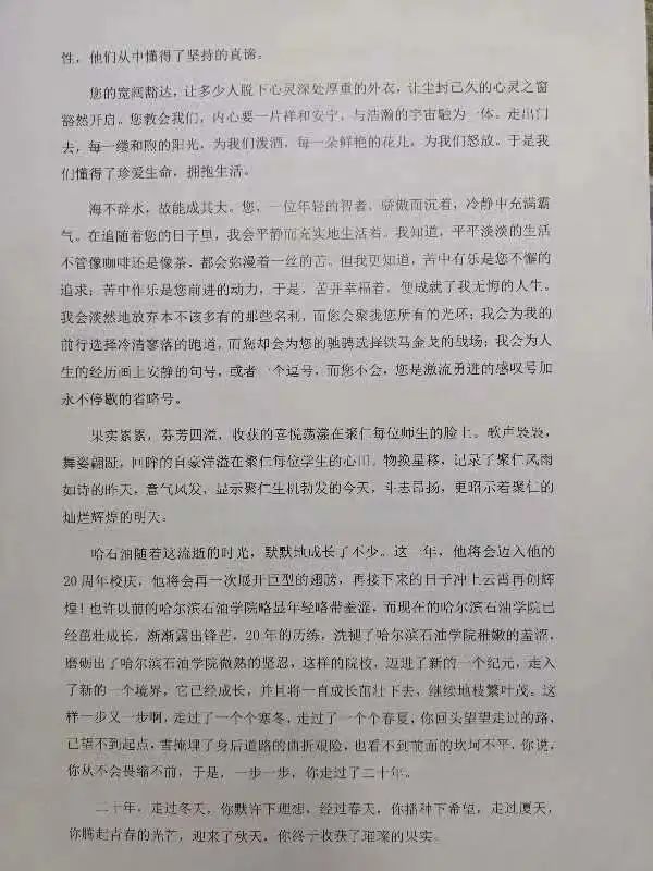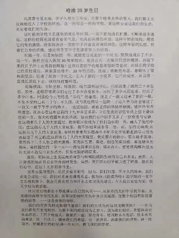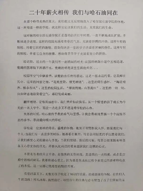 此次活动得到了全院同学们的积极响应和参与,征文以“我与哈油的故事”、“我的哈油记忆”、“哈油20岁生日快乐”等为主题,利用PPT从不同角度,讲述自己与金沙检测线路js69的故事,抒发自己的哈油情怀。同学们紧贴主题,以饱含情感的语言表达了对哈油的热爱,通过不同形式回顾学校建校20年来的光辉岁月,展现了一代代人薪火相传、励志前行的精神风貌,征文内容涉及哈油印象、哈油故事、学校历史变迁、寄语母校等。