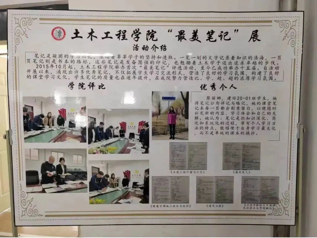 为了让全校师生都能领略到优秀课堂笔记的风采,引导更多同学端正学习态度,关注课堂笔记,现将评选出的最美笔记制作成精美展板,在第一教学楼4楼进行展示,供同学们学习与欣赏。展出的每一本课堂笔记都体现出记录者们的认真和专注:工整的字迹,圈点勾画式的批注,关键内容的红笔备注,大小字体的区分……通过笔记,不仅能看到同学们善于归纳总结、踏实严谨的学习态度,还能感受到我院学子们朝气蓬勃、积极向上精神状态。