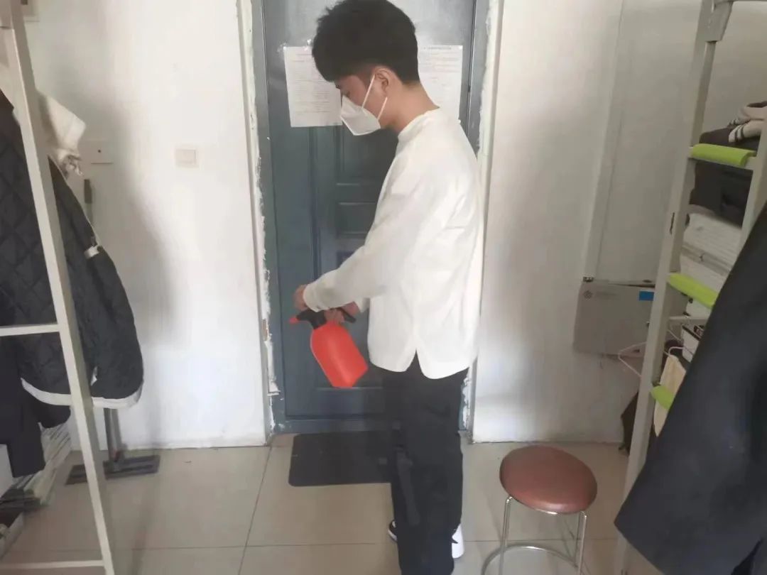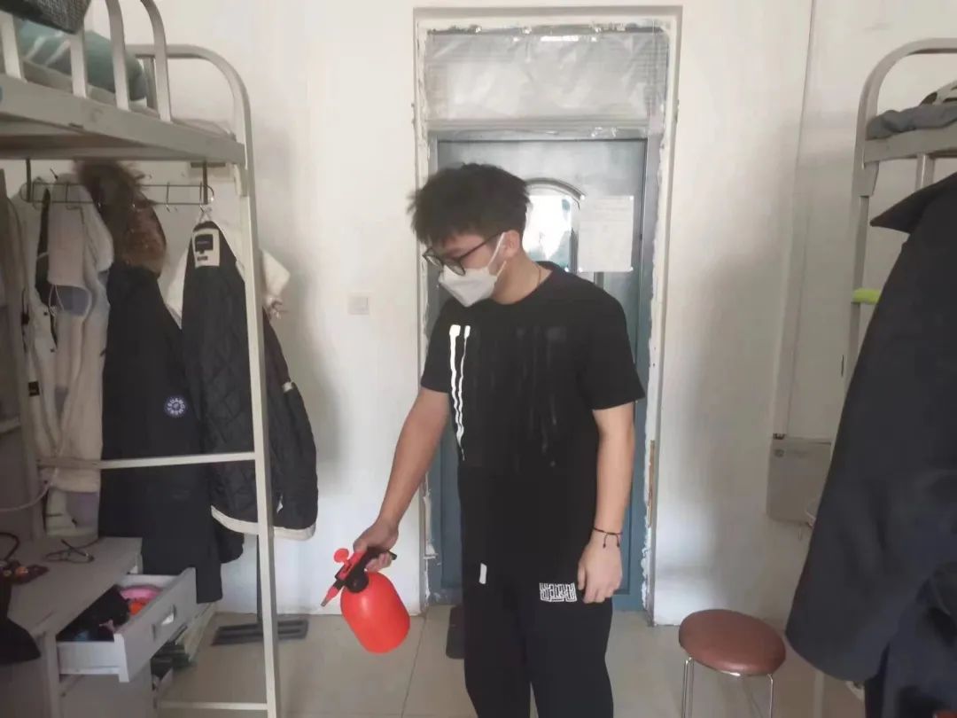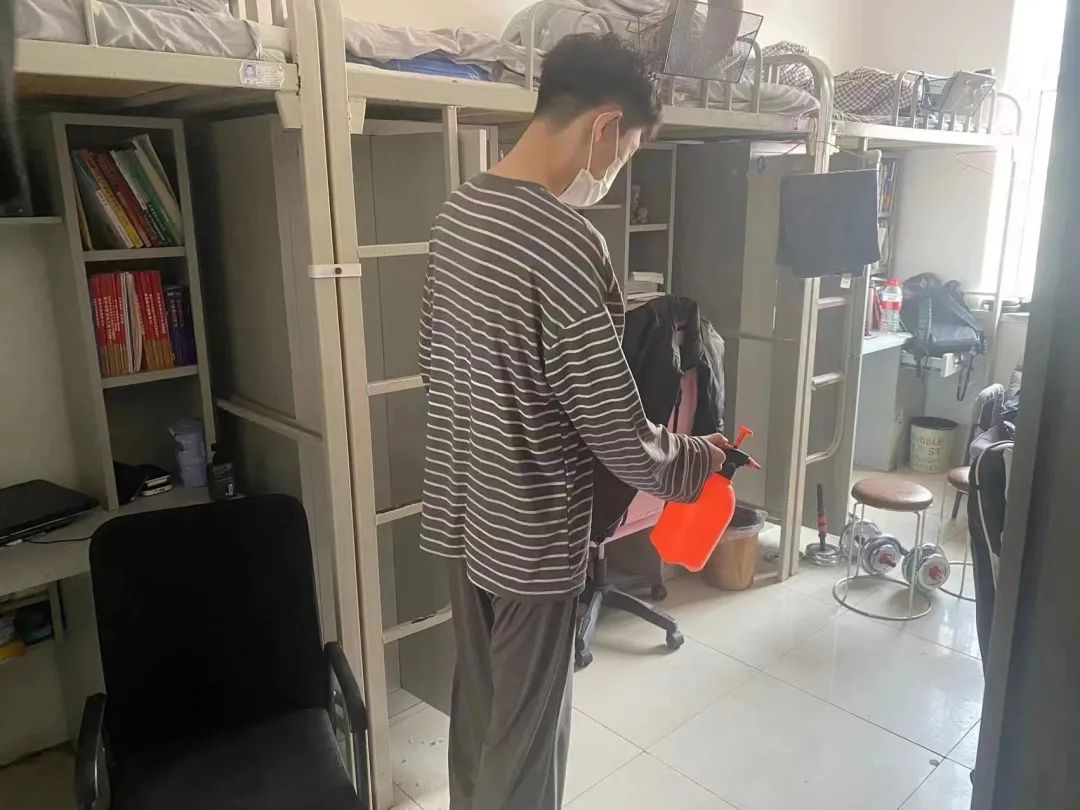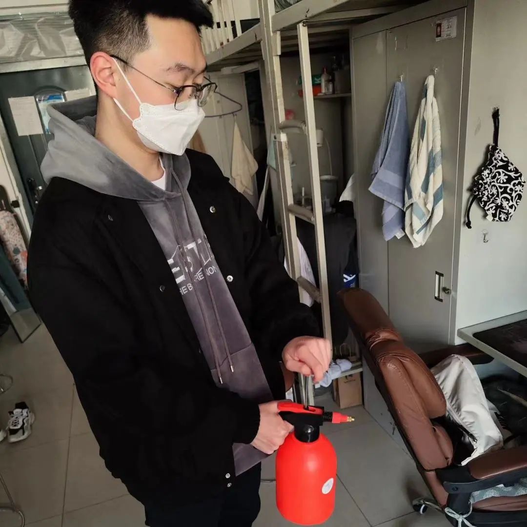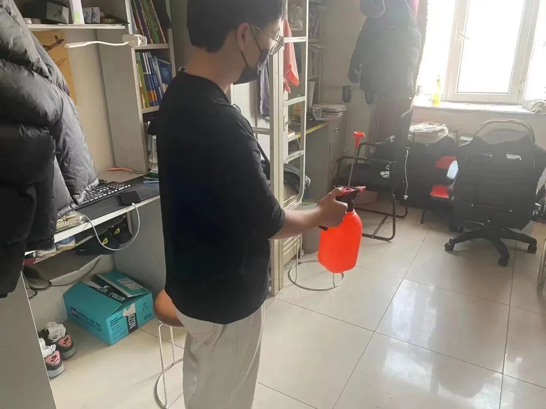消杀过程中,党员们分工明确,严格按照卫生消杀的标准规范,进行全面细致的消杀作业,确保寝室内不留死角,全方位覆盖,保证寝室的每一处地方都得到了有效的卫生消杀。
