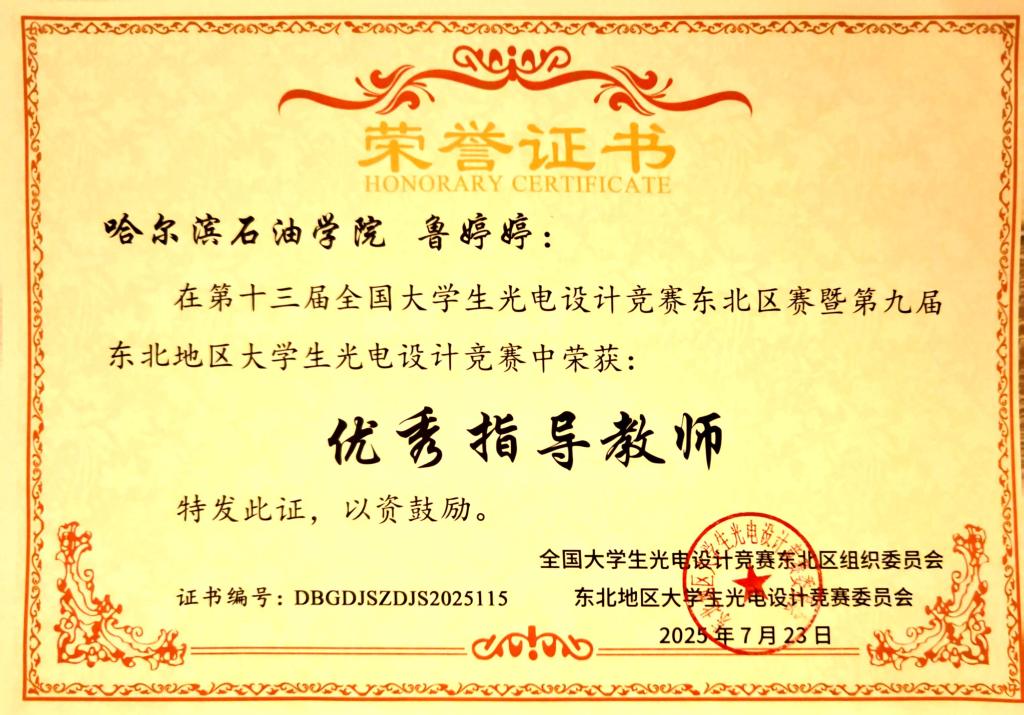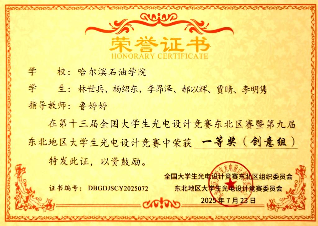 2025年7月21日至23日,第十三届全国大学生光电设计竞赛东北赛区暨第九届东北地区大学生光电设计竞赛在哈尔滨工程大学举行。本次赛事汇聚了哈尔滨工业大学等50所高校的1213支队伍,各高校精英队伍同场竞技。金沙官网数理教研部全体物理教师指导的各团队在本次赛事中获得优异成绩,其中,鲁婷婷指导的“风车团队”凭借扎实的专业功底、创新的设计理念和出色的现场表现,在激烈角逐中脱颖而出,斩获“创意组一等奖 ”,为学校争得了荣誉。