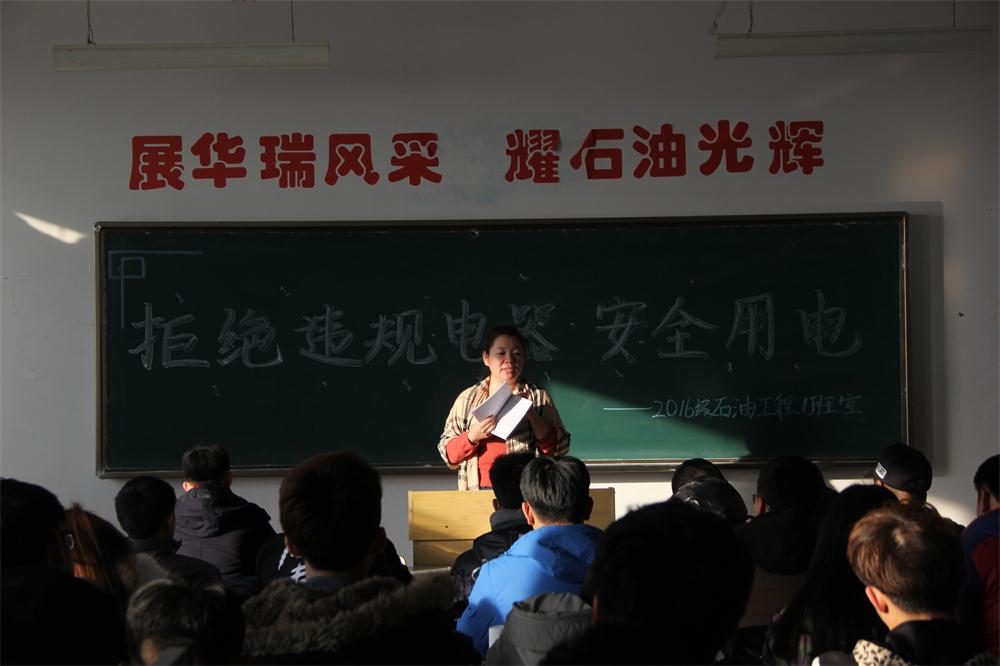 为提高同学们的安全意识,消除宿舍安全隐患,营造良好宿舍环境,石油工程学院于2016年11月28日上午8点30分在主教703教室召开2016级“拒绝违规电器,文明安全用电”安全教育活动,我院2016级辅导员张雪组织全体2016级同学参加会议。