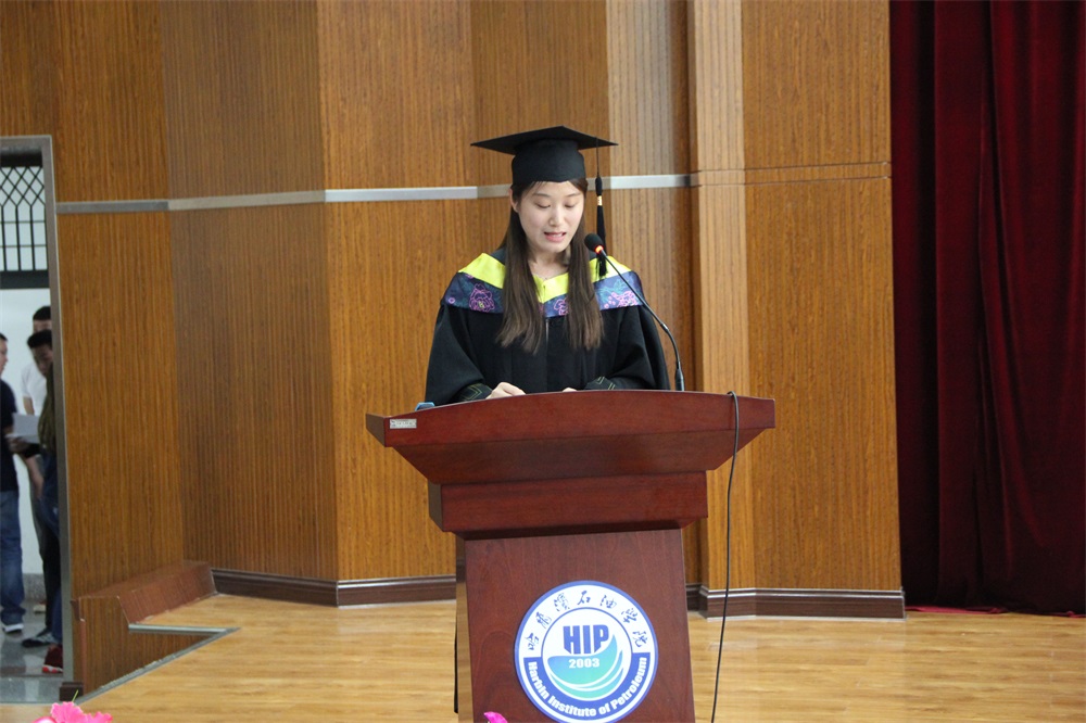 副院长李岳祥作为教师代表发言。他与同学们分享了自己与2016届毕业生四年来成长和收获的感悟,勉励同学们,你们在“哈石油”接受到的熏陶和学会的本领,会让你们有底气面对未来生活中的坎坷与挫折,也会让你们更加自信地踏出一个精彩的未来。