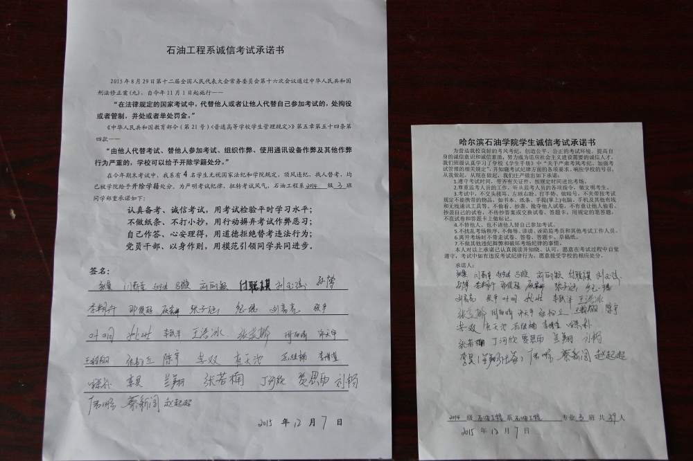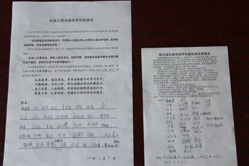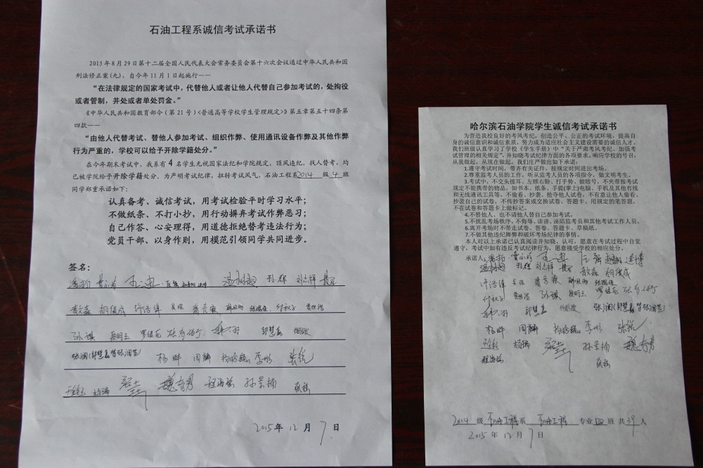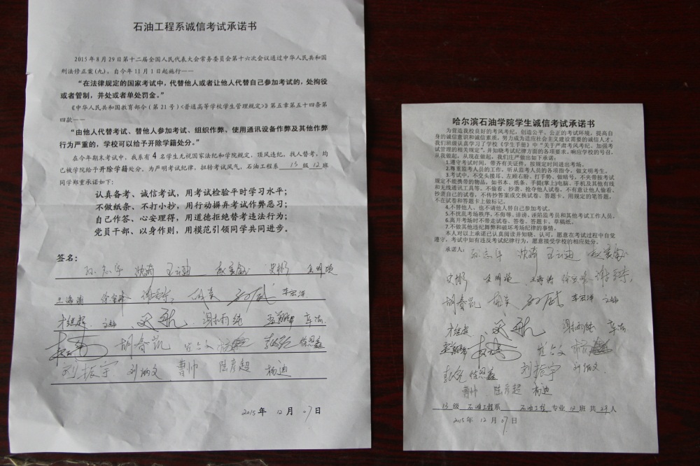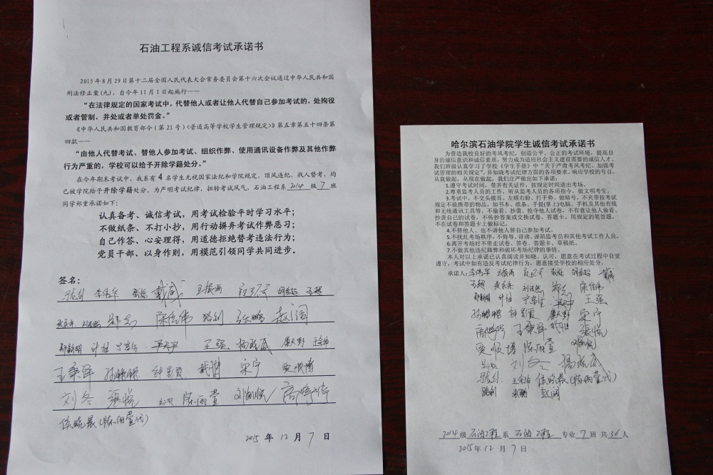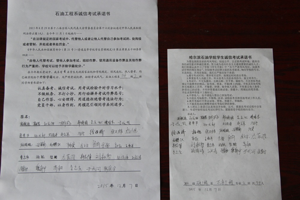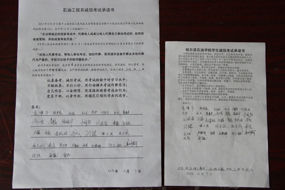 石油工程系要求班级每名学生同时在学院和系印发的考试承诺书上签名,在外实习的学生也要指定专人代替签字,做到不漏一人。同时,在考试这项工作上做到“两个绝不”:在考试违纪的问题上,绝不包庇护短,绝不回避问题。对出现问题的学生,坚决支持学院有关部门依纪依规做出严肃处理,为学院学风考风建设保驾护航。