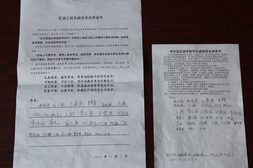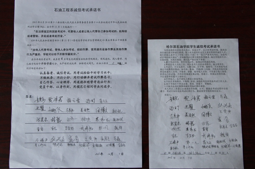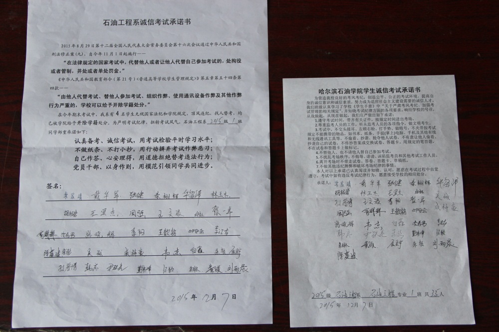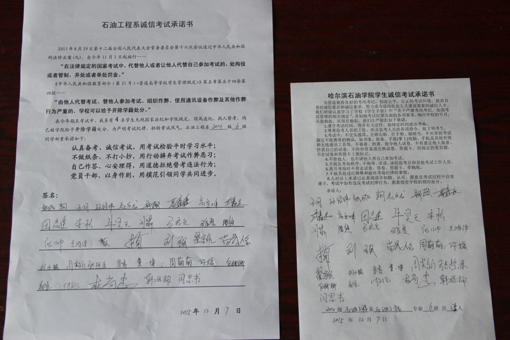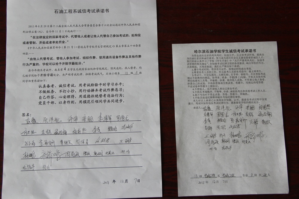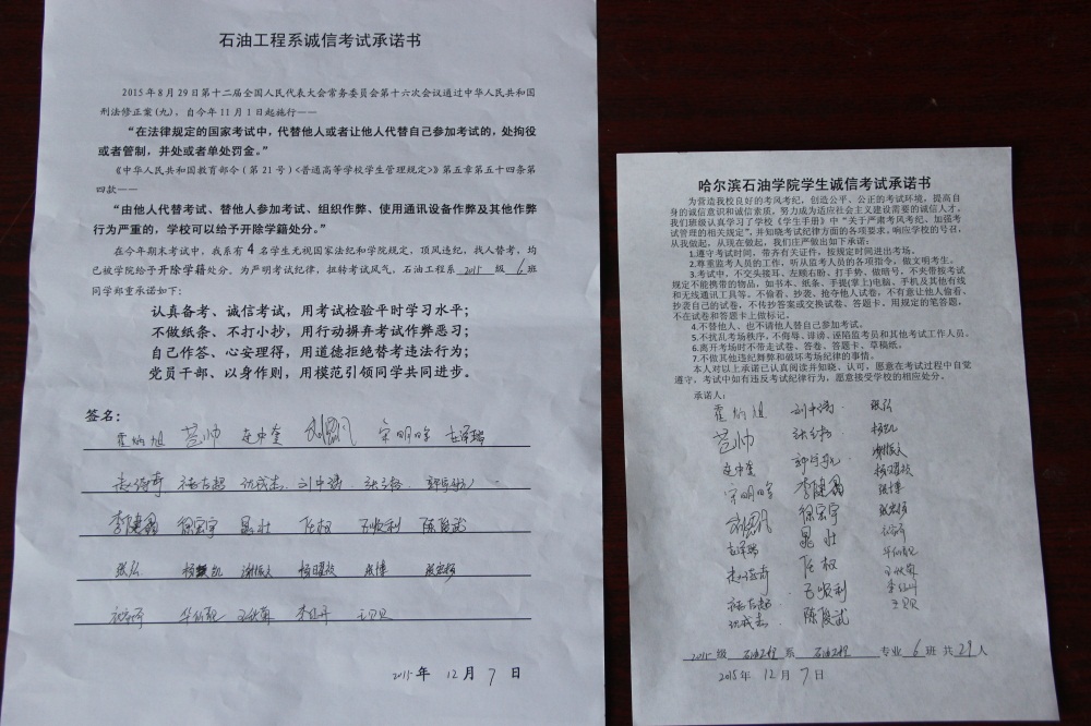 石油工程系要求班级每名学生同时在学院和系印发的考试承诺书上签名,在外实习的学生也要指定专人代替签字,做到不漏一人。同时,在考试这项工作上做到“两个绝不”:在考试违纪的问题上,绝不包庇护短,绝不回避问题。对出现问题的学生,坚决支持学院有关部门依纪依规做出严肃处理,为学院学风考风建设保驾护航。
